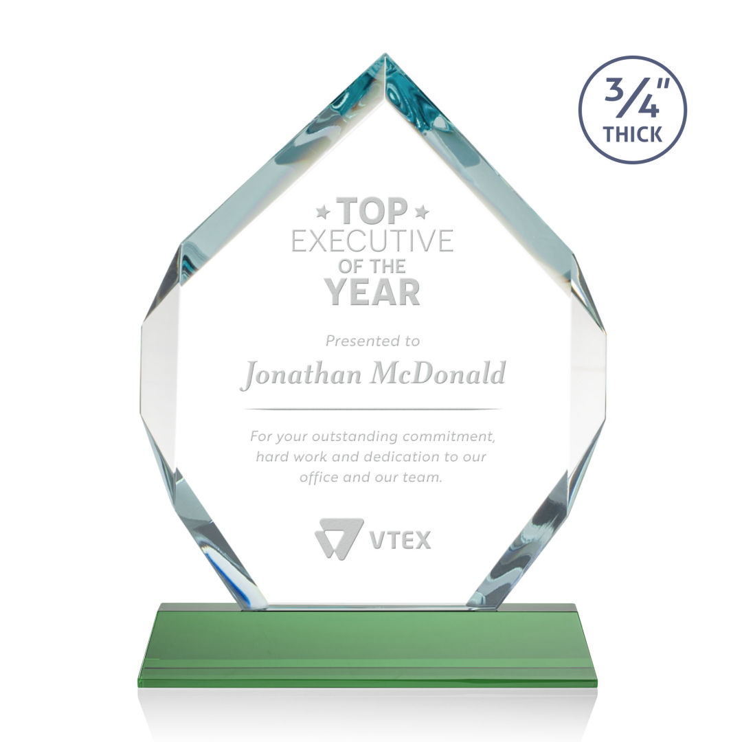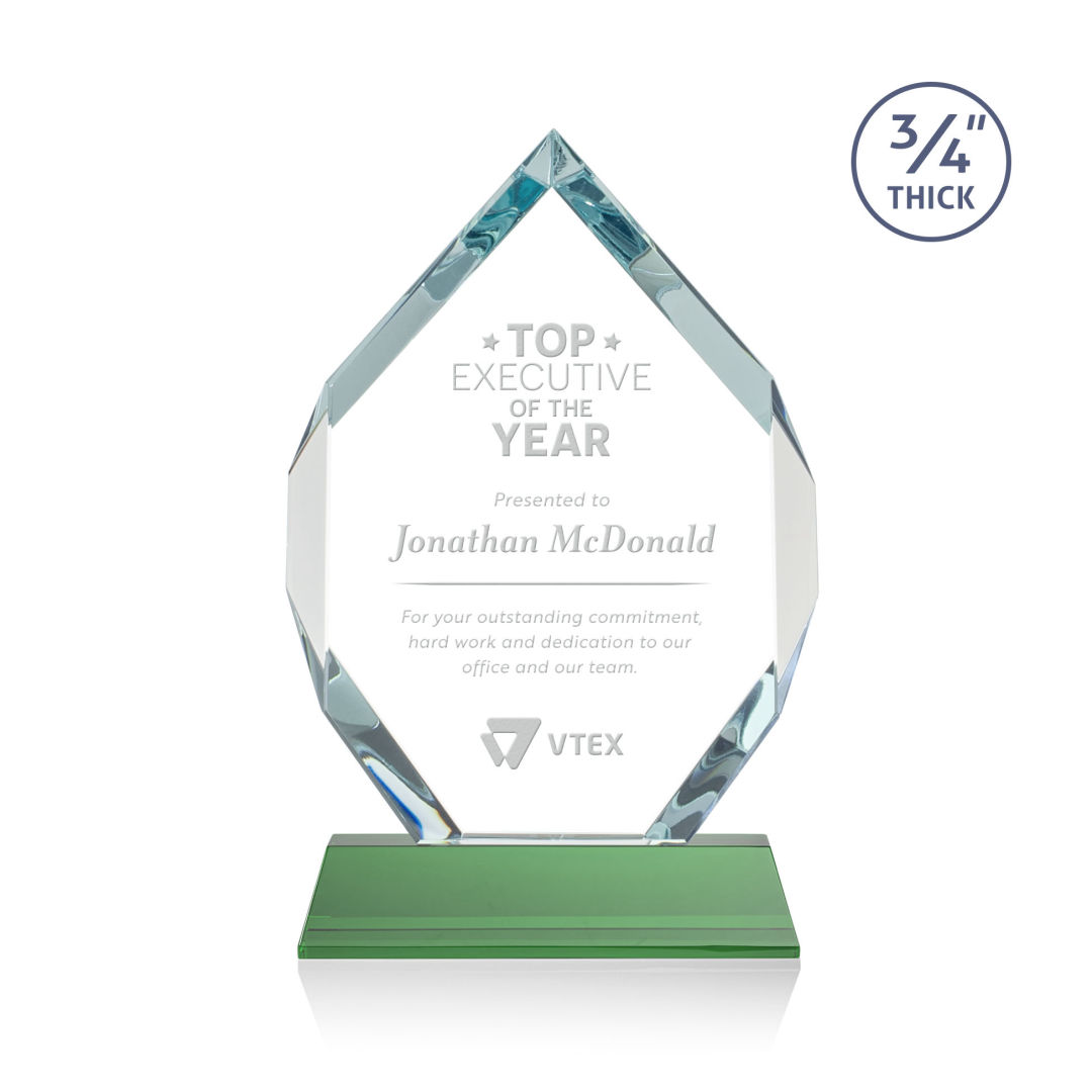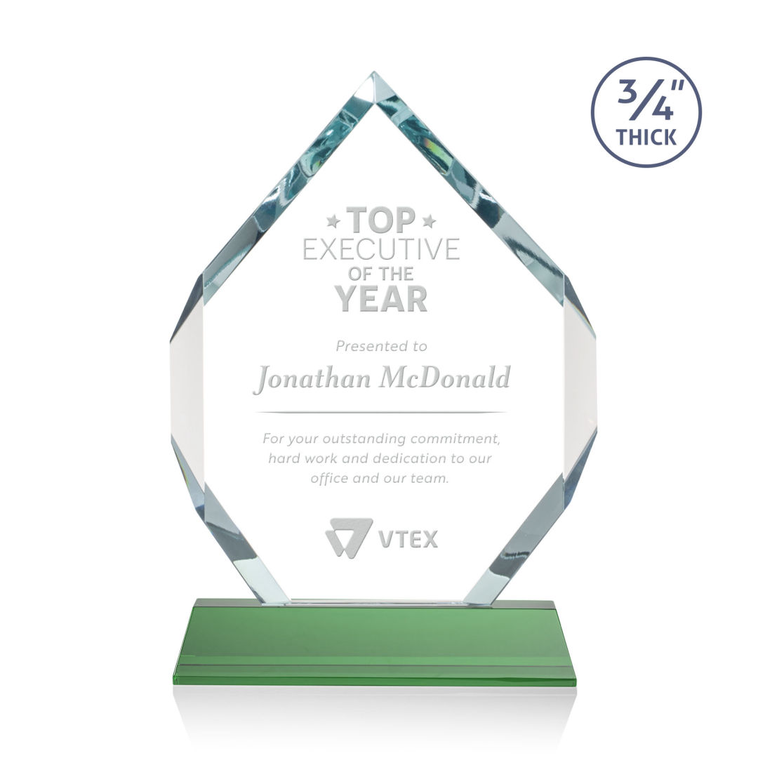 The Royal Diamond is a symmetrical six-sided Starfire award with constant-width bevels on the front top and bottom sides and on the back middle sides. The prominent, highly polished bevels accentuate the sparkle of the glass, generate diverse and attractive reflections along the edges, and frame the central etching area. Mounted on a tall tapered optical crystal base. Second Position Etch & Colorfill Optional. 5.0″ W x 8.0″ H x 2.0″ D
