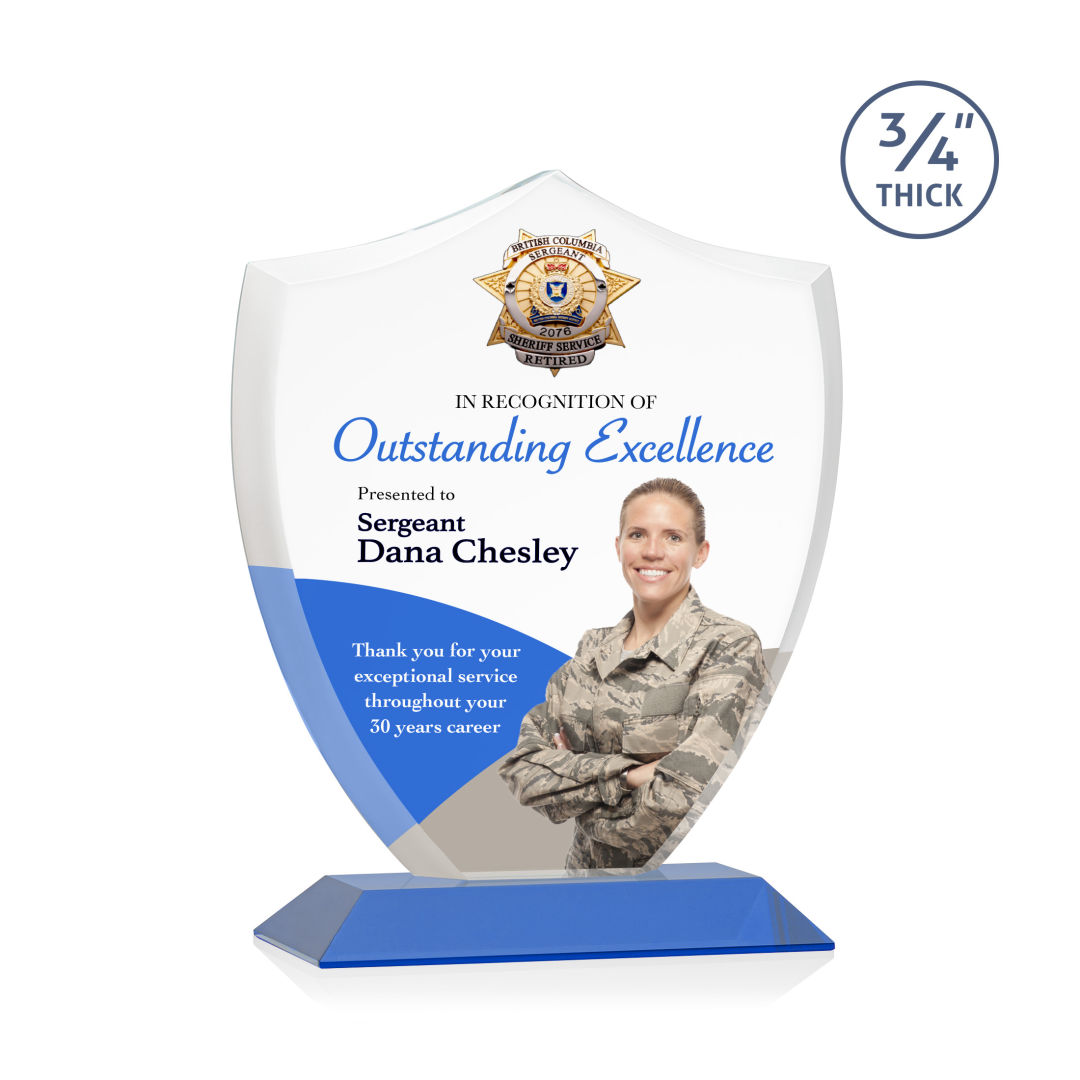 The Royal Diamond is a symmetrical six-sided Starfire award with constant-width bevels on the front top and bottom sides and on the back middle sides. The prominent, highly polished bevels accentuate the sparkle of the glass, generate diverse and attractive reflections along the edges, and frame the central etching area. The award is mounted onto a triple-stepped Bamboo Base. 5.0″ W x 7.25″ H x 3.0″ D
