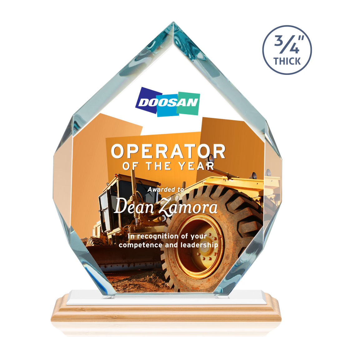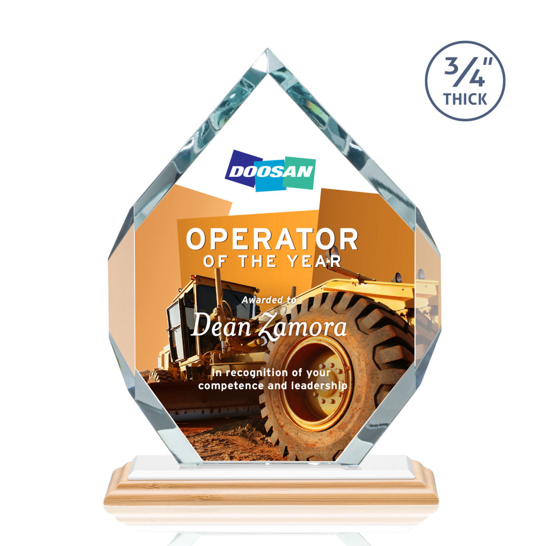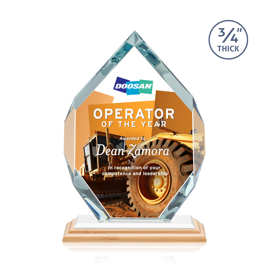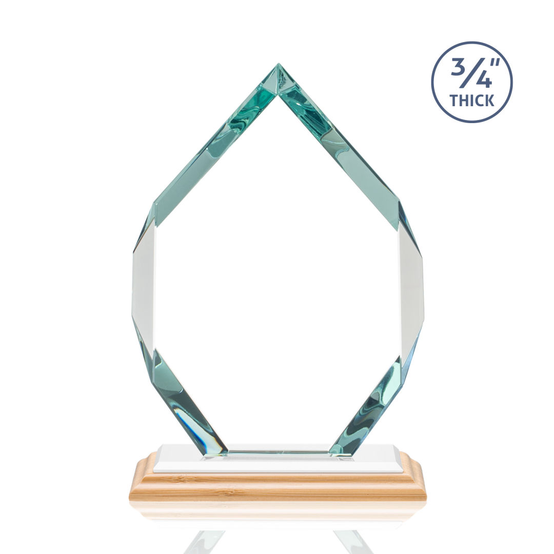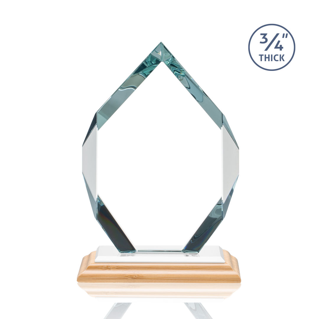 The Royal Diamond is a symmetrical six-sided Starfire award with constant-width bevels on the front top and bottom sides and on the back middle sides. The prominent, highly polished bevels accentuate the sparkle of the glass, generate diverse and attractive reflections along the edges, and frame the central etching area. The award is mounted onto a triple-stepped Bamboo Base. 5.0″ W x 7.25″ H x 3.0″ D