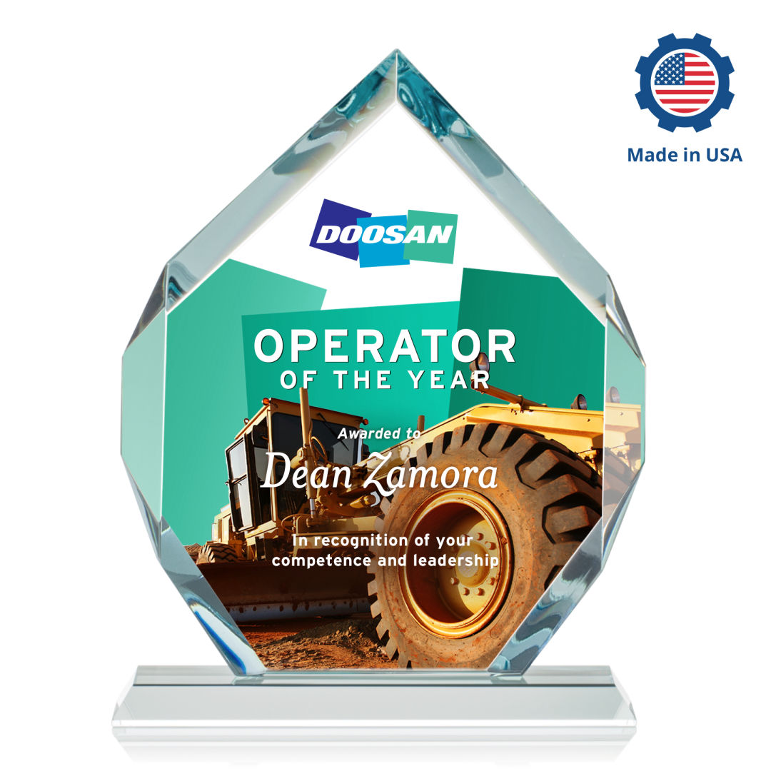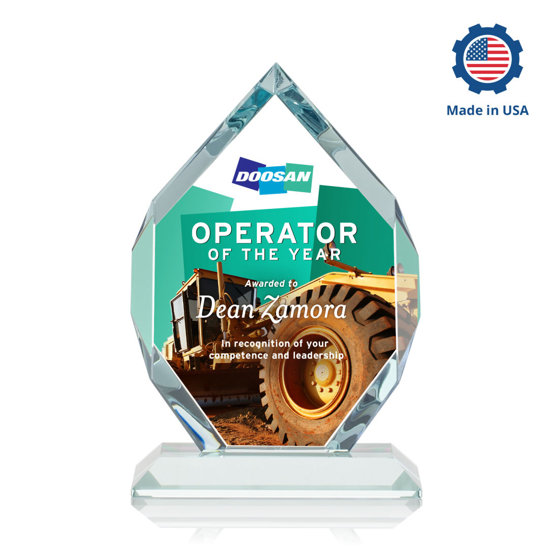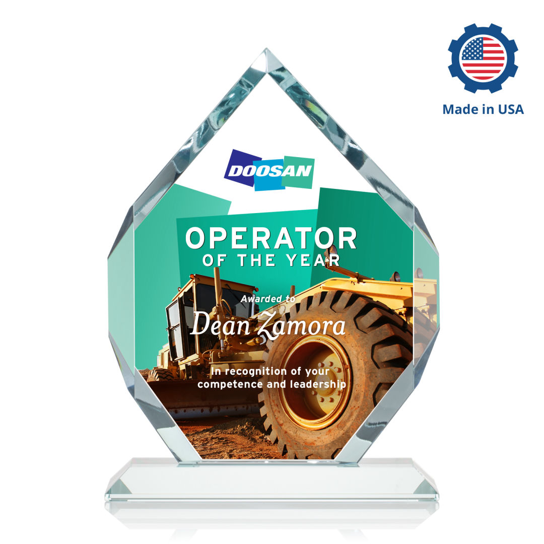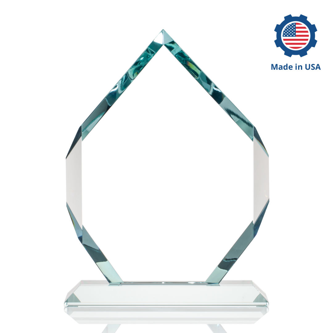 The Royal Diamond is a symmetrical six-sided Starfire award with constant-width bevels on the front top and bottom sides and on the back middle sides. The prominent, highly polished bevels accentuate the sparkle of the glass, generate diverse and attractive reflections along the edges, and frame the central etching area. Manufactured and Decorated in the USA. 5.0″ W x 7.25″ H x 3.0″ D