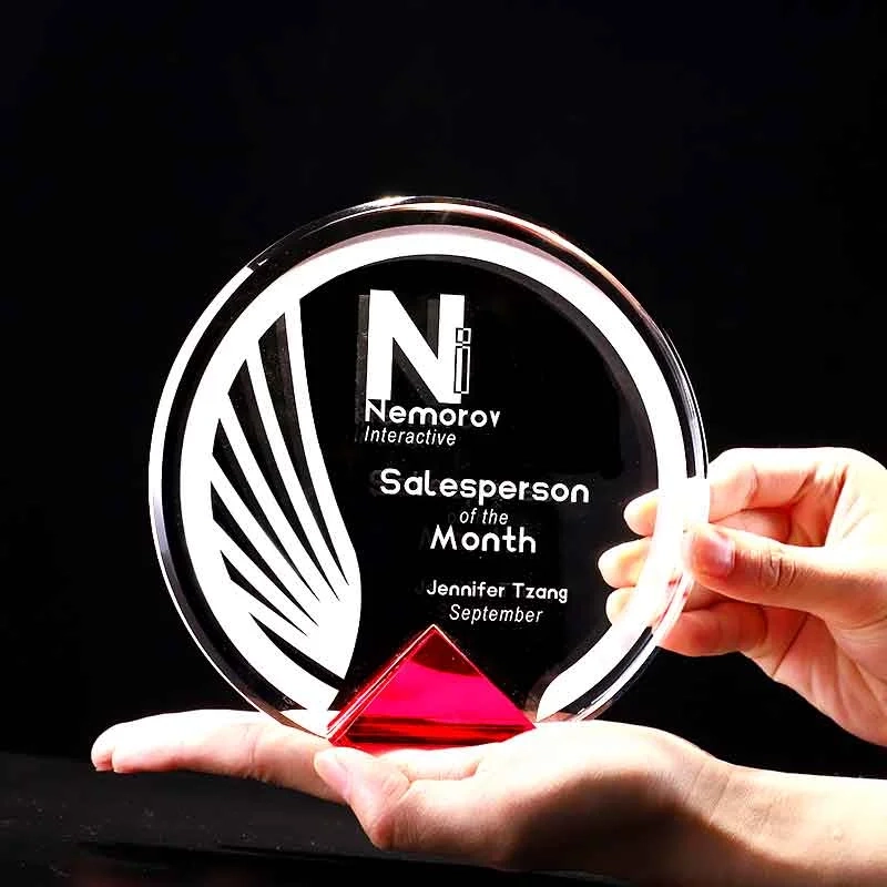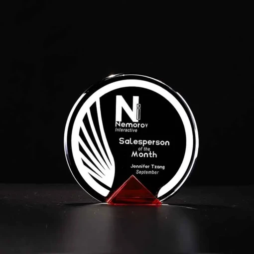 The Ruby Award features a highly polished clear Optic Crystal Circle. At the bottom of the Circle is a flat surface with a red Optic Crystal Triangle. The Ruby Awards come in premium quality Black presentation boxes. These awards are available as a blank for engravers, or if you prefer we can do the engraving for you. 5″ L x 0.4″ W x 4.8″ H