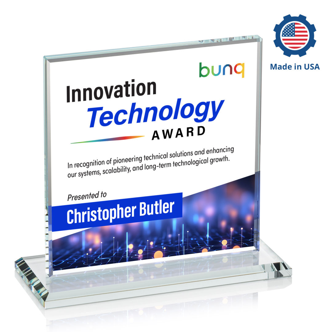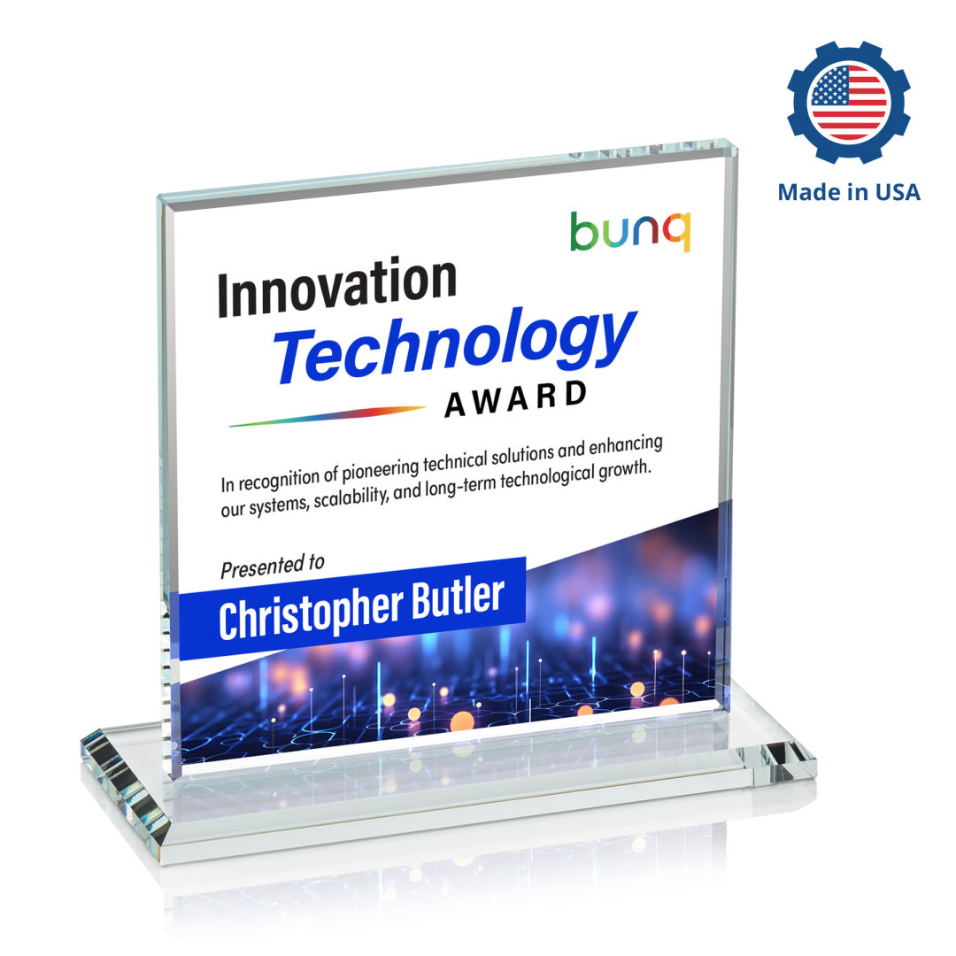 Bold Sahara VividPrint™ Award features a 0.5″ thick Starfire crystal mounted on a vibrant flat-edged base for a spectacular work of achievement recognition. Bring your artwork to life with full-color VividPrint™!Manufactured and Decorated in the USA. 5.0″ W x 4.375″ H x 3.0″ D