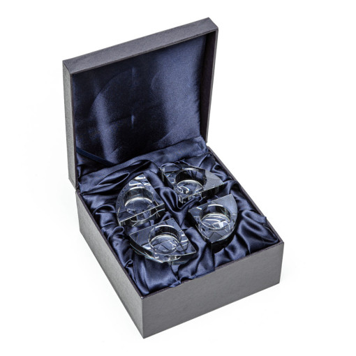 Magnificent thick Optical Crystal Candleholder set.Staggered heights makes this dazzling set a gift to remember.Candles included. 3.5″ W x 1.75″ H