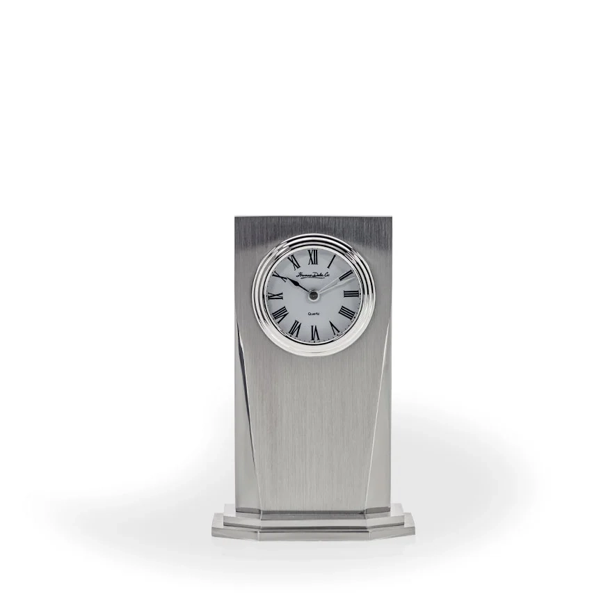 This unique looking clock features a sleek urban, yet classic look with a body made entirely from brushed metal. The round clock dial stands out against the brushed metal, with a bright finished metal frame and white background with large Roman numerals. This Thomas Dale Co. Sandi Brushed Metal Desk Clock stands at 6-3/8″ tall and features significant space on the front panel for adding names and gift or award information directly to the metal surface. 6.375″ H x 4″ W x 1.5″ D