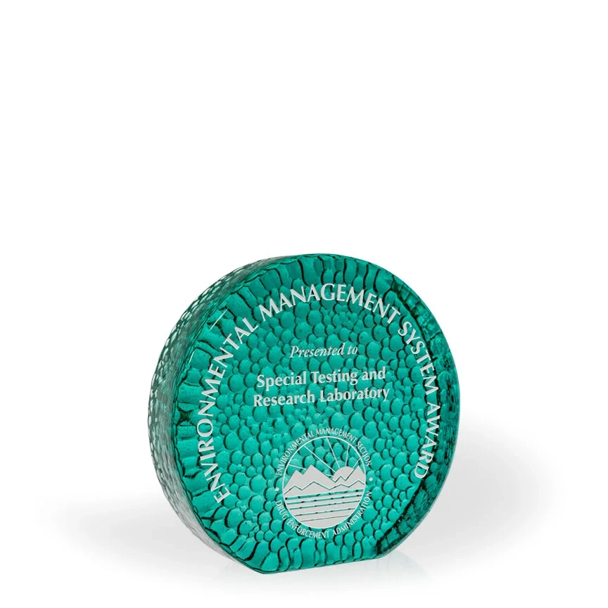 The Sardinia Raindrop Recycled Glass Award is a stunning eco-friendly award option. This award series is made in the USA from 100% recycled glass material. The free-standing round shape allows plenty of space for etching your logo and text, and is color filled with silver for visibility. Recycled glass awards are hand made, and each piece can be slightly different in color, shape and size. Bubbles and swirls are a part of the process and are considered normal and acceptable. 5 1/4″ H x 5 1/2″ W x 1 1/4″ Thick