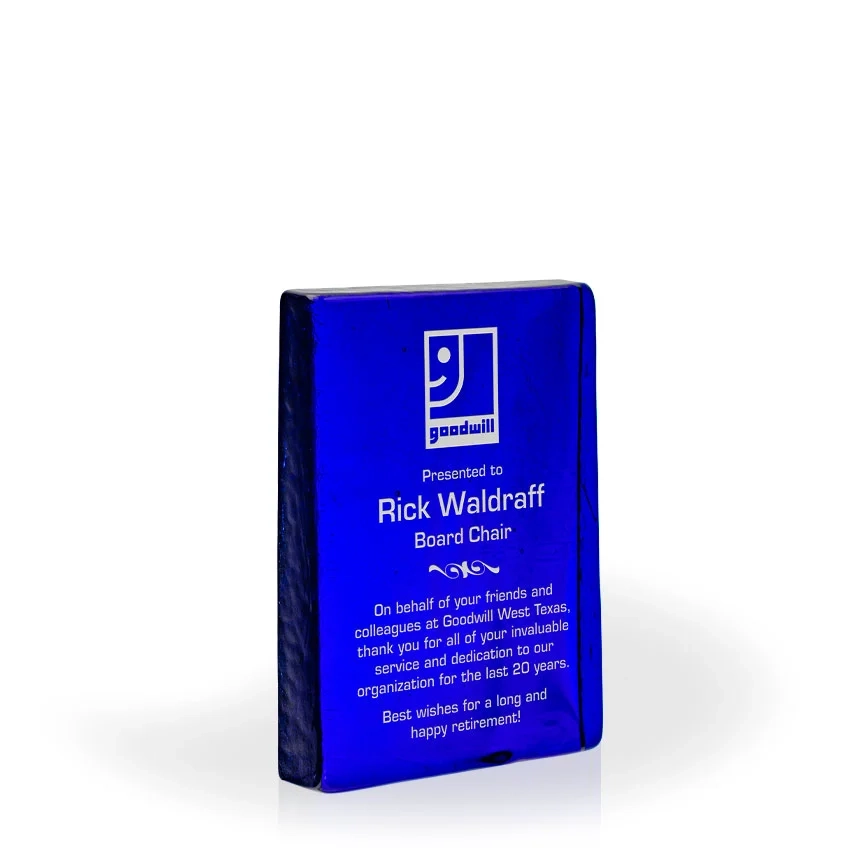 The Sargossa Vertical Wedge Recycled Glass Award is a stunning eco-friendly award option. This award series is made in the USA from 100% recycled glass material. The free-standing rectangular shape allows plenty of space for etching your logo and text, and is color filled with silver for visibility. Recycled glass awards are hand made, and each piece can be slightly different in color, shape and size. Bubbles and swirls are a part of the process and are considered normal and acceptable. 7″ H x 5″ W x 1 1/4″ Thick