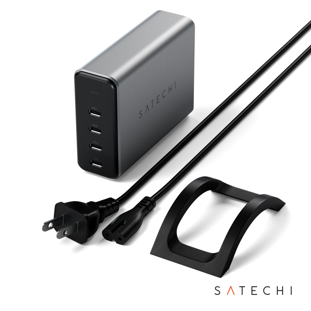 Take your desktop charging to the next level with the Satechi 165W USB-C 4-Port PD GaN Charger, featuring Gallium Nitride (GaN) technology to power up to four devices simultaneously. Equipped with four USB-C PD ports to support multiple power configurations up to 165W, the 165W USB-C 4-Port PD GaN Charger can easily power your MacBook Pro M1 at full speed, or your iPad Pro setup on-the-go, so you can keep working while your devices are charging. Not compatible with Android devices.[Check out this quick guide to help navigate how to use!](https://cdn.shopify.com/s/files/1/1520/4366/files/165W_GaN_4-Port_Wall_Charger.pdf?v=1641597966)Product Size: 3.93″ W x 2.8″ H x 1.22″ D. 3.93″ W x 2.8″ H x 1.22″ D