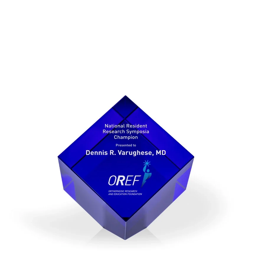 The gorgeous Savannah Crystal Cube Award is an elegant and easy addition to any award program. Available in four colors (clear, black, blue, or green) this gorgeous cubed, optic crystal award works well for programs with different recognition levels, and for when you want to maintain a consistent look between types of awards in your organization. This Savannah Crystal Cube measures 3″ across on each side; when standing on the “clipped” corner, the award measures in at 4.75″ in height. 3″ H x 3″ W x 3″ D