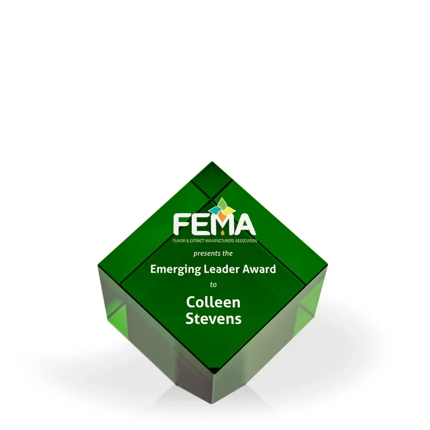 The gorgeous Savannah Crystal Cube Award is an elegant and easy addition to any award program. Available in four colors (clear, black, blue, or green) this gorgeous cubed, optic crystal award works well for programs with different recognition levels, and for when you want to maintain a consistent look between types of awards in your organization. This Savannah Crystal Cube measures 3″ across on each side; when standing on the “clipped” corner, the award measures in at 4.75″ in height. 3″ H x 3″ W x 3″ D
