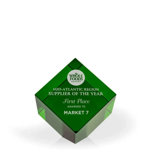 The gorgeous Savannah Crystal Cube Award is an elegant and easy addition to any award program. Available in four colors (clear, black, blue, or green) this gorgeous cubed, optic crystal award works well for programs with different recognition levels, and for when you want to maintain a consistent look between types of awards in your organization. This Savannah Crystal Cube measures 3″ across on each side; when standing on the “clipped” corner, the award measures in at 4.75″ in height. 3″ H x 3″ W x 3″ D