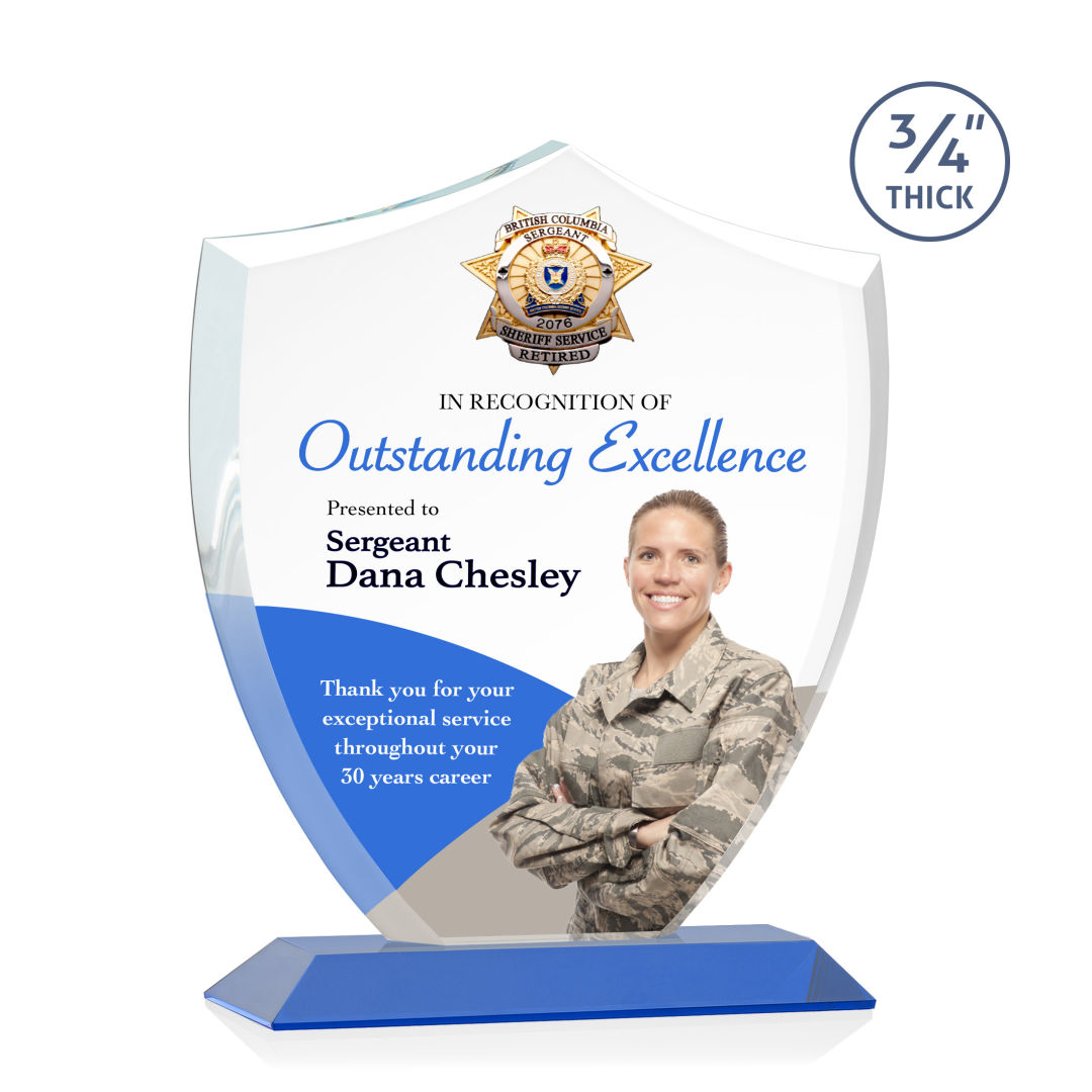A shield signifies protection, authority, and stability, making the Scudo Shield VividPrint™ Award suitable for recognizing outstanding excellence for first responders and law enforcement. This Starfire Crystal Award features beveled edges and is mounted on a mitered Starfire Crystal Base. Let your message POP with full-color VividPrint™! 6.25″ W x 7.75″ H x 3.0″ D