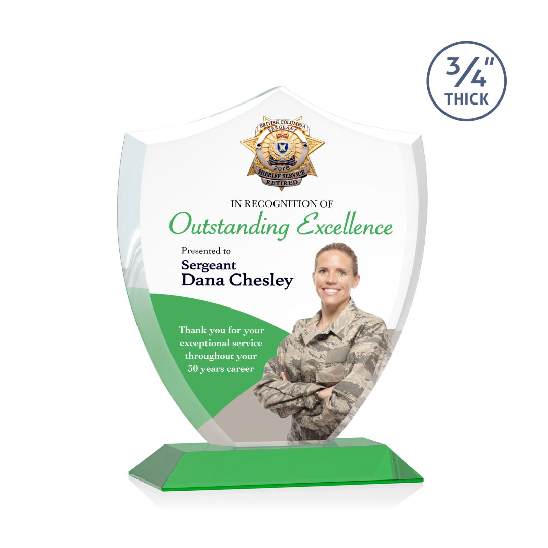 A shield signifies protection, authority, and stability, making the Scudo Shield VividPrint™ Award suitable for recognizing outstanding excellence for first responders and law enforcement. This Starfire Crystal Award features beveled edges and is mounted on a mitered Starfire Crystal Base. Let your message POP with full-color VividPrint™! 6.25″ W x 7.75″ H x 3.0″ D