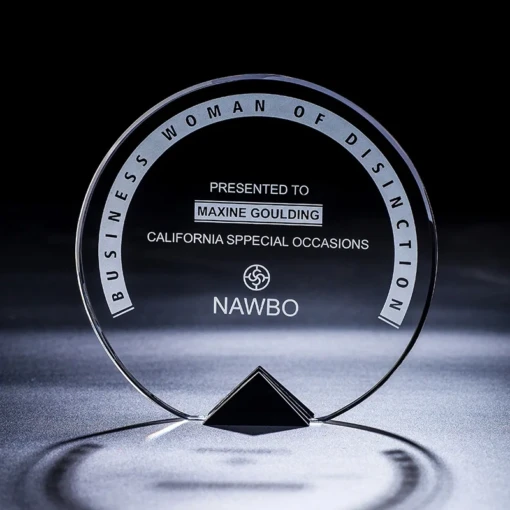 The Selena Award features a highly polished clear Optic Crystal Circle. At the bottom of the Circle is a flat surface with a black Optic Crystal Triangle bonded to form a base for the Selena Award. The Selena Awards come in a premium quality presentation box. These awards are available as a blank for engravers, or if you prefer we can do the engraving for you. 5″ L x 0.4″ W x 4.8″ H