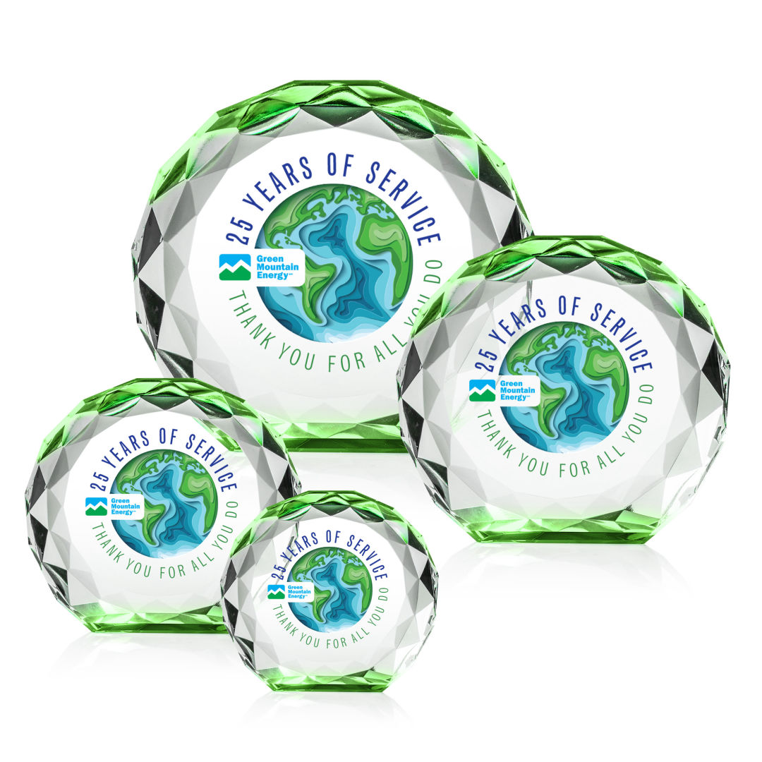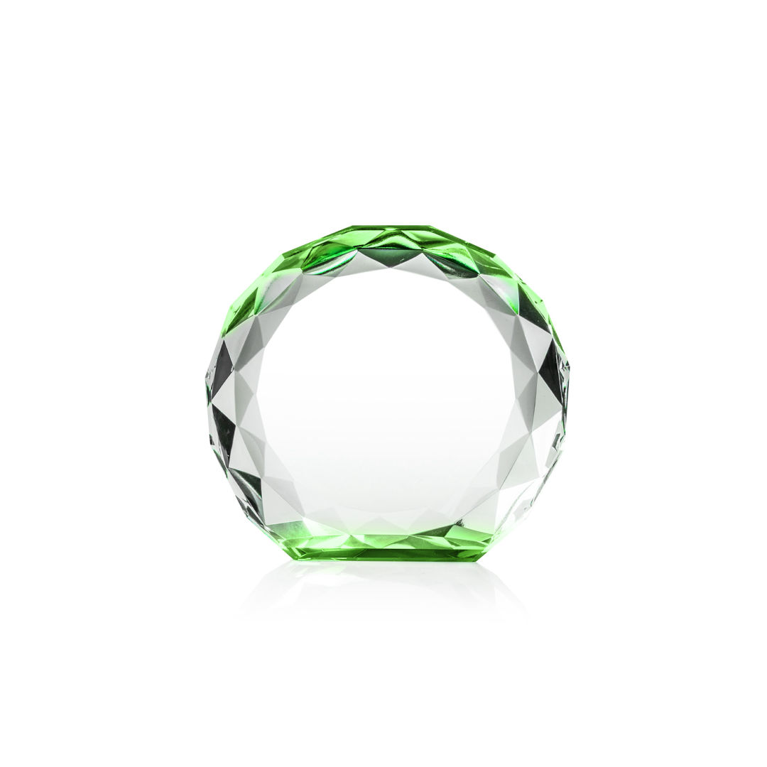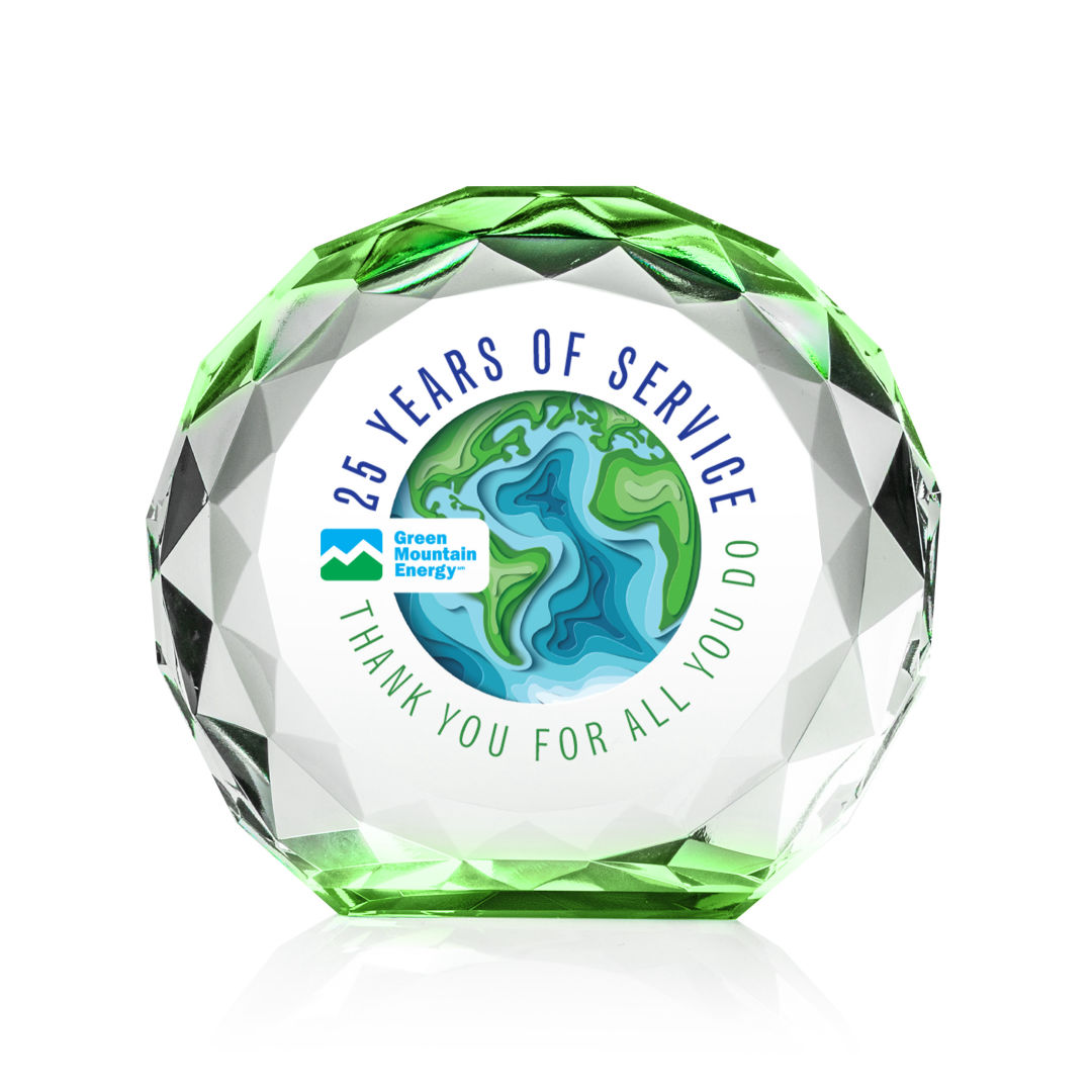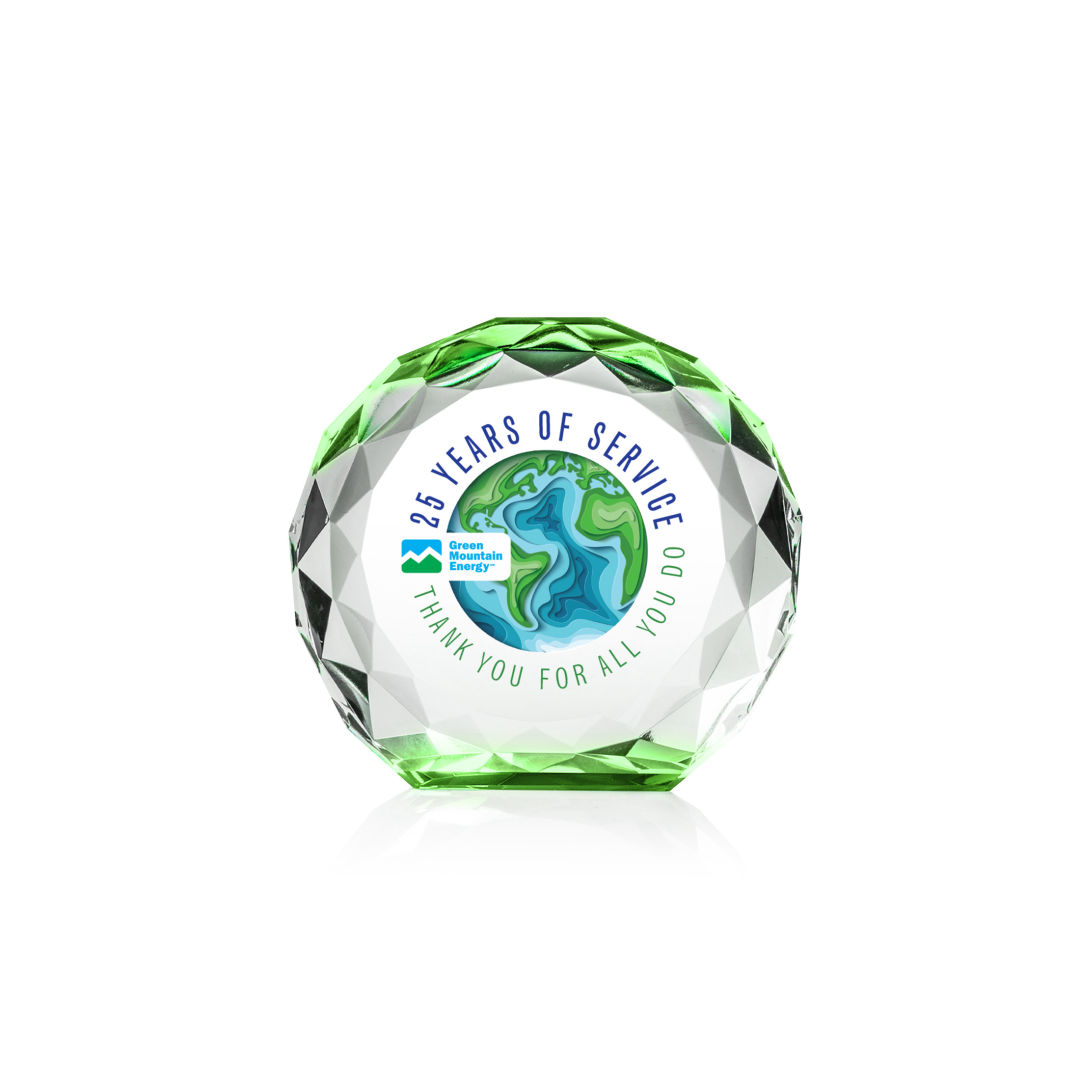 The Seville VividPrint™ Award is a freestanding crystal award with a round, gem-cut shape that beautifully catches and reflects light from every angle. Its colorful base radiates vibrant hues upward, creating a striking prism effect throughout the entire piece. Both elegant and eye-catching, this award is perfect for recognizing milestones and achievements with a touch of brilliance. Bring your design to life with brilliant full-color VividPrint™, adding depth and vibrancy to every detail of your artwork. 4.0″ W x 3.75″ H x 1.25″ D