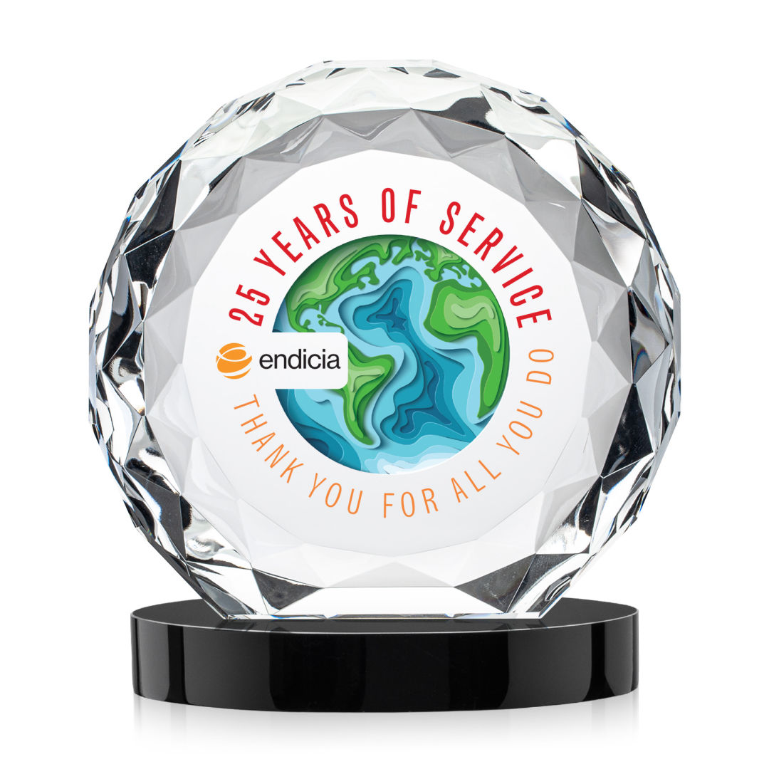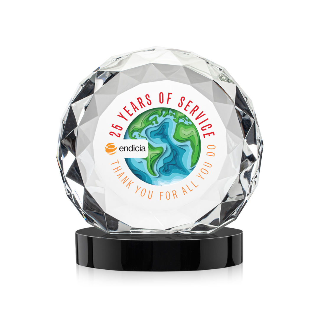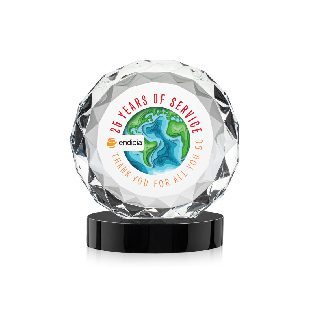 The VividPrint™ Seville on Alberton Base combines the elegance of the gem-cut Seville Award with the bold presence of a solid crystal base. Its oval-shaped base supports the faceted round award with vibrant reflections that enhance its brilliance. Perfect for milestones, achievements, or recognition, this piece delivers a striking balance of sophistication and impact. Bring your design to life with brilliant full-color VividPrint™, adding depth and vibrancy to every detail of your artwork. 4.0″ W x 4.75″ H x 2.25″ D