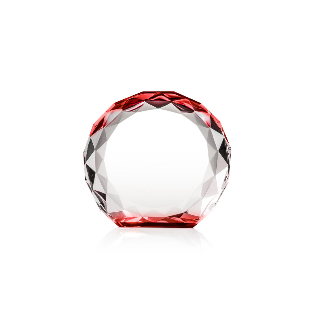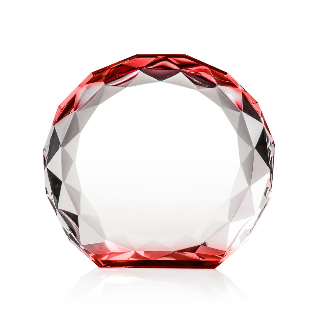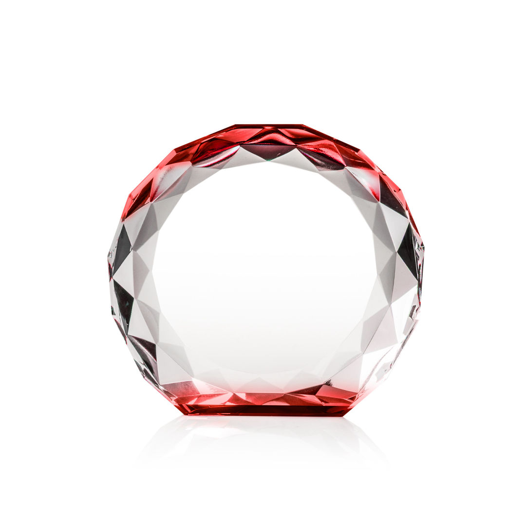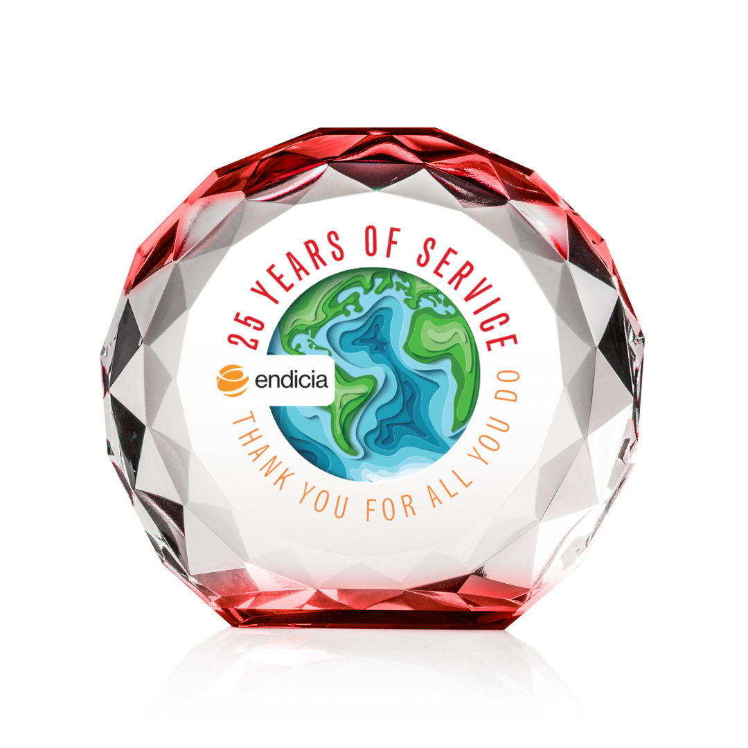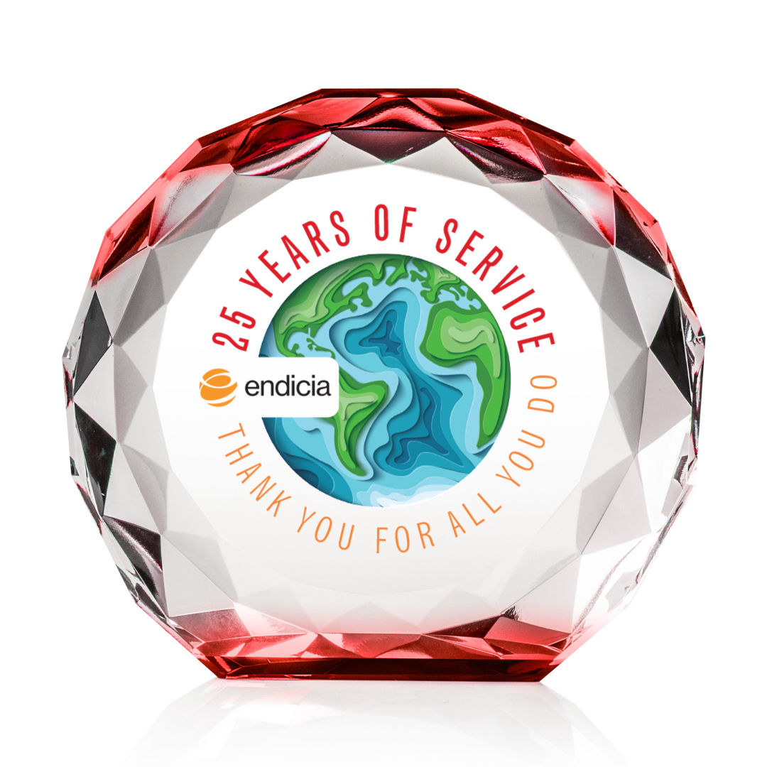 The Seville VividPrint™ Award is a freestanding crystal award with a round, gem-cut shape that beautifully catches and reflects light from every angle. Its colorful base radiates vibrant hues upward, creating a striking prism effect throughout the entire piece. Both elegant and eye-catching, this award is perfect for recognizing milestones and achievements with a touch of brilliance. Bring your design to life with brilliant full-color VividPrint™, adding depth and vibrancy to every detail of your artwork. 4.0″ W x 3.75″ H x 1.25″ D