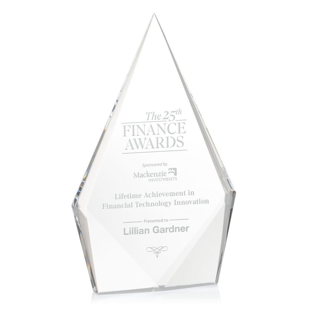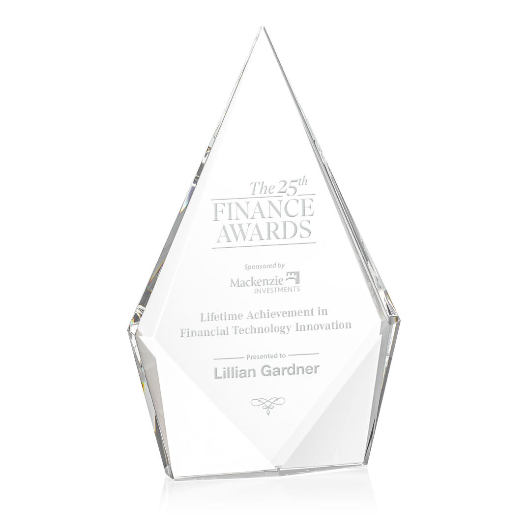 The Optical Crystal Shelton Award features a striking diamond shape with an elongated peak, symbolizing excellence and ambition. Freestanding with polished bottom bevels, it makes a bold and elegant statement of achievement. 5.0″ W x 6.0″ H x 1.25″ D
