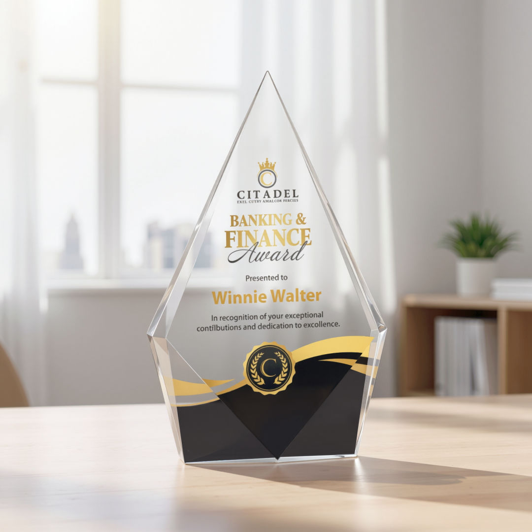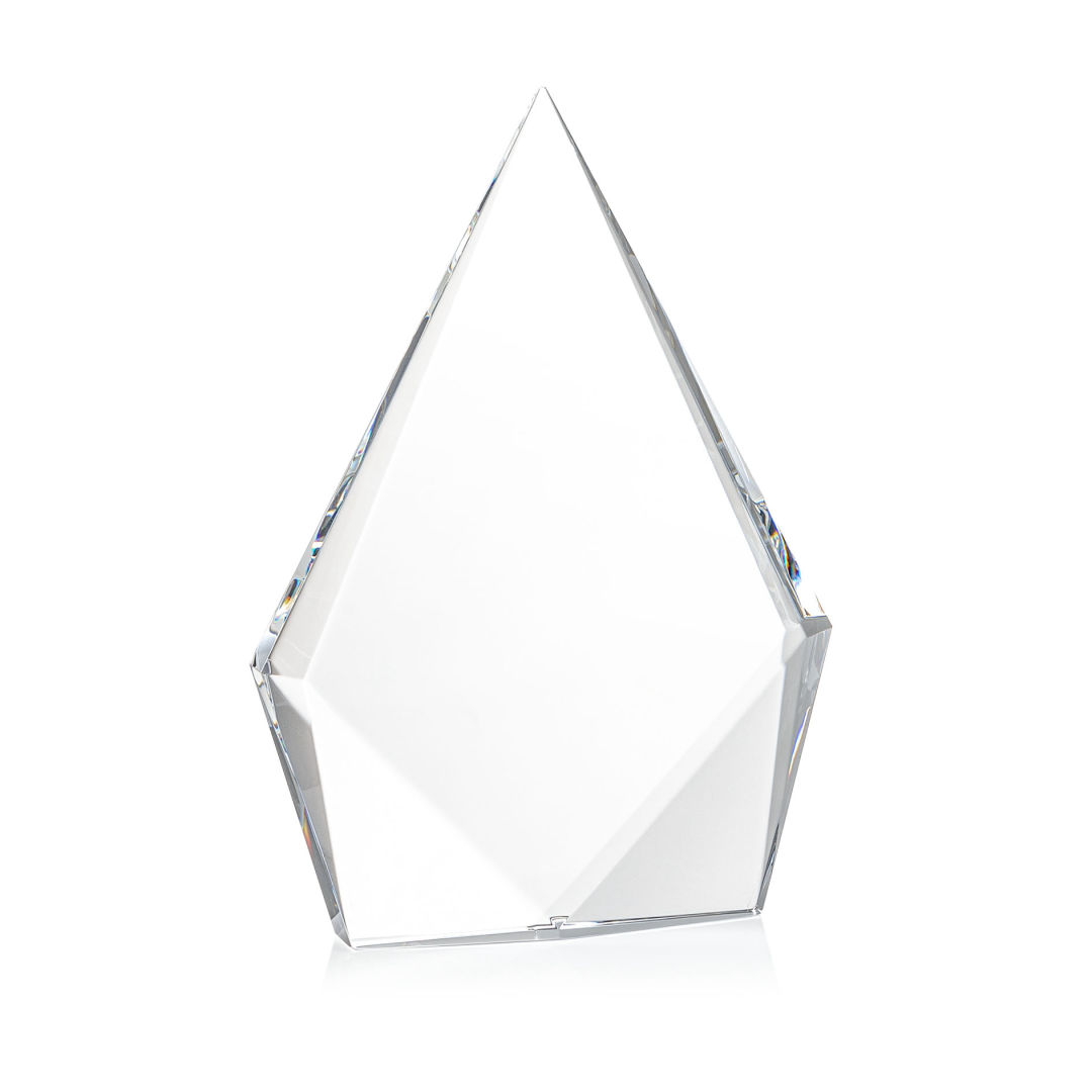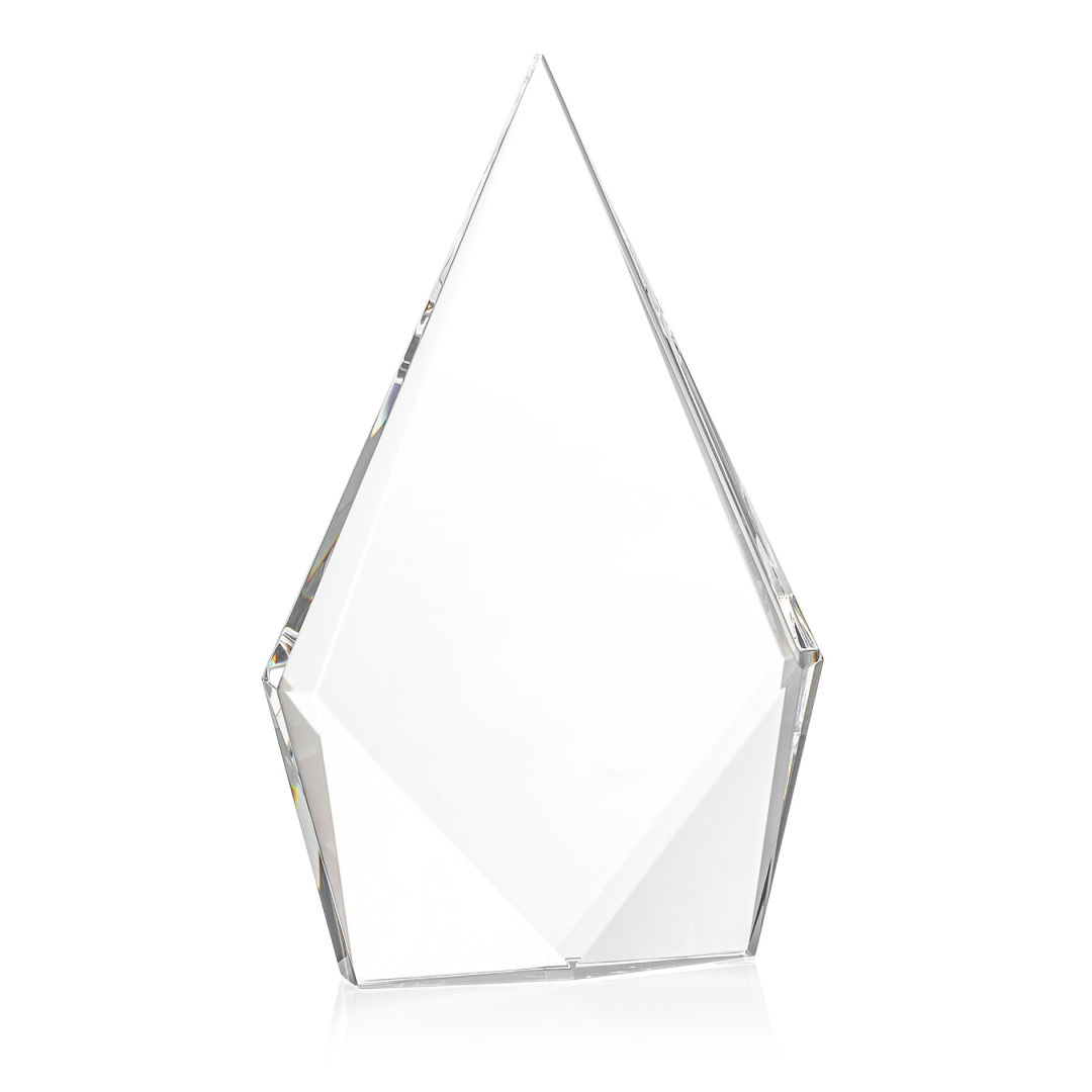 The Optical Crystal Shelton VividPrint™ Award features a striking diamond shape with an elongated peak, symbolizing excellence and ambition. Freestanding with polished bottom bevels, it makes a bold and elegant statement of achievement. 5.0″ W x 6.0″ H x 1.25″ D