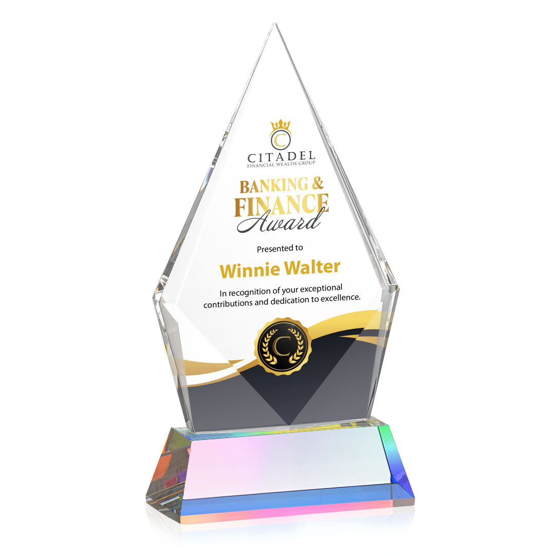 The Optical Crystal Shelton VividPrint™ Award on Newhaven base features a striking diamond shape with an elongated peak, symbolizing excellence and ambition. With polished bottom bevels, it makes a bold and elegant statement of achievement. Mounted on a tall tapered optical crystal base. 5.0″ W x 7.5″ H x 2.0″ D