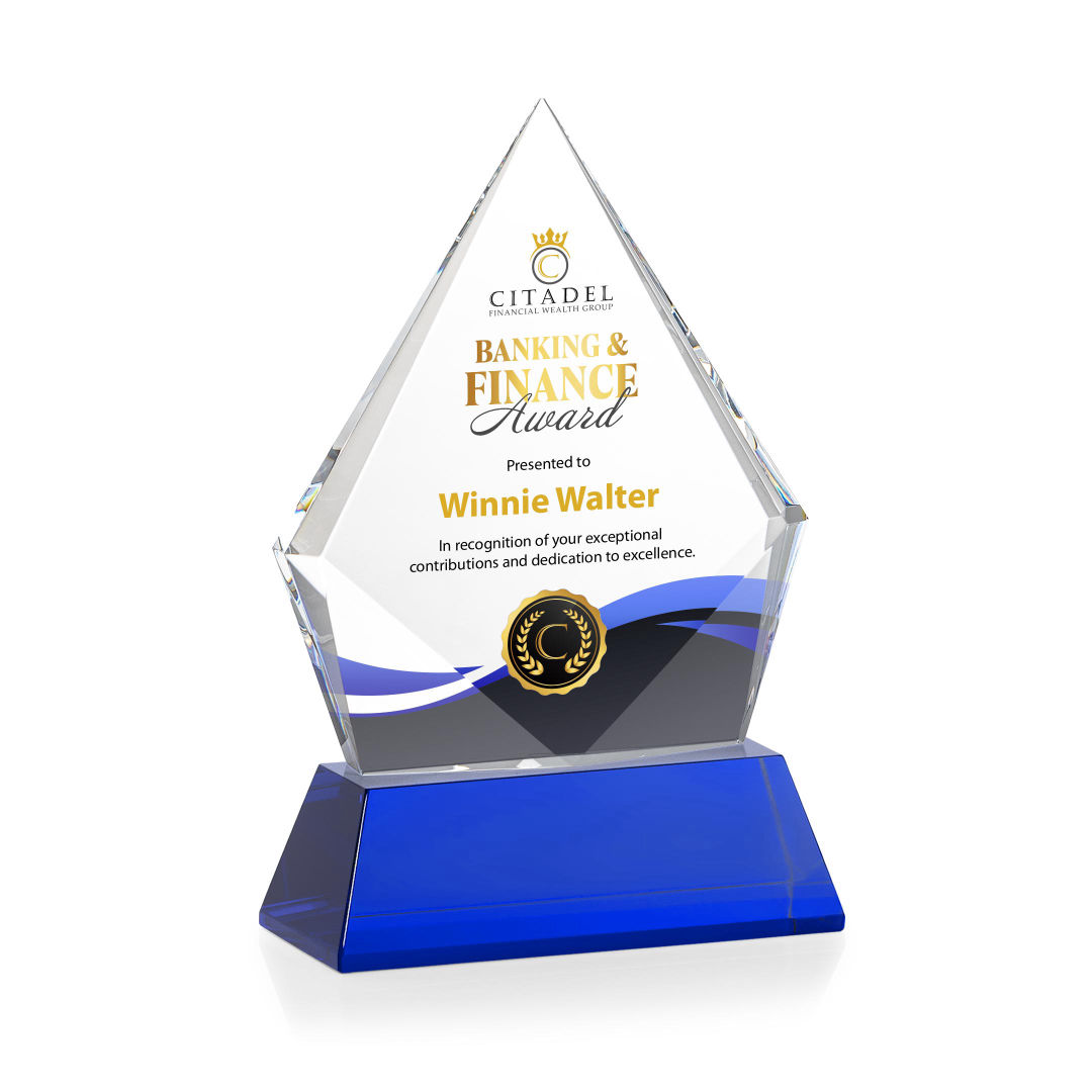 The Optical Crystal Shelton VividPrint™ Award on Newhaven base features a striking diamond shape with an elongated peak, symbolizing excellence and ambition. With polished bottom bevels, it makes a bold and elegant statement of achievement. Mounted on a tall tapered optical crystal base. 5.0″ W x 7.5″ H x 2.0″ D