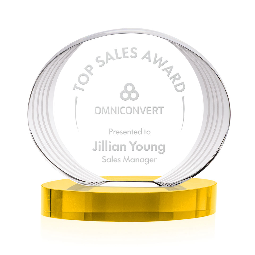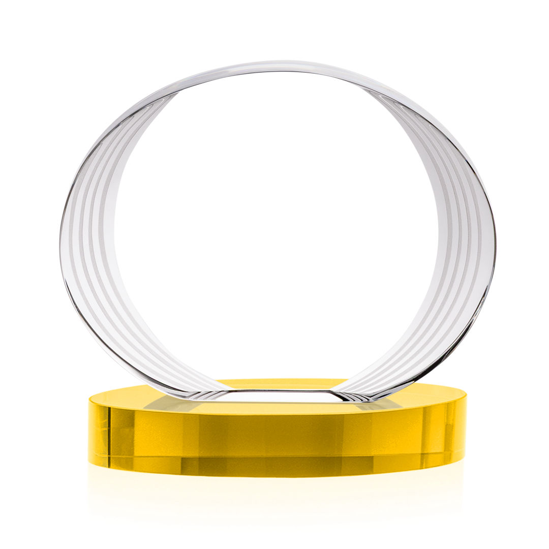 The Sheraton Oval Award on Base features a sleek, concave oval design with a striped, ridged edge that creates a refined fanfare around the imprint area. Its layered detailing adds depth while elegantly highlighting your personalized message or logo. Mounted on a solid base, this award offers a polished and contemporary way to honor achievement. 5.0″ W x 5.0″ H x 2.5″ D