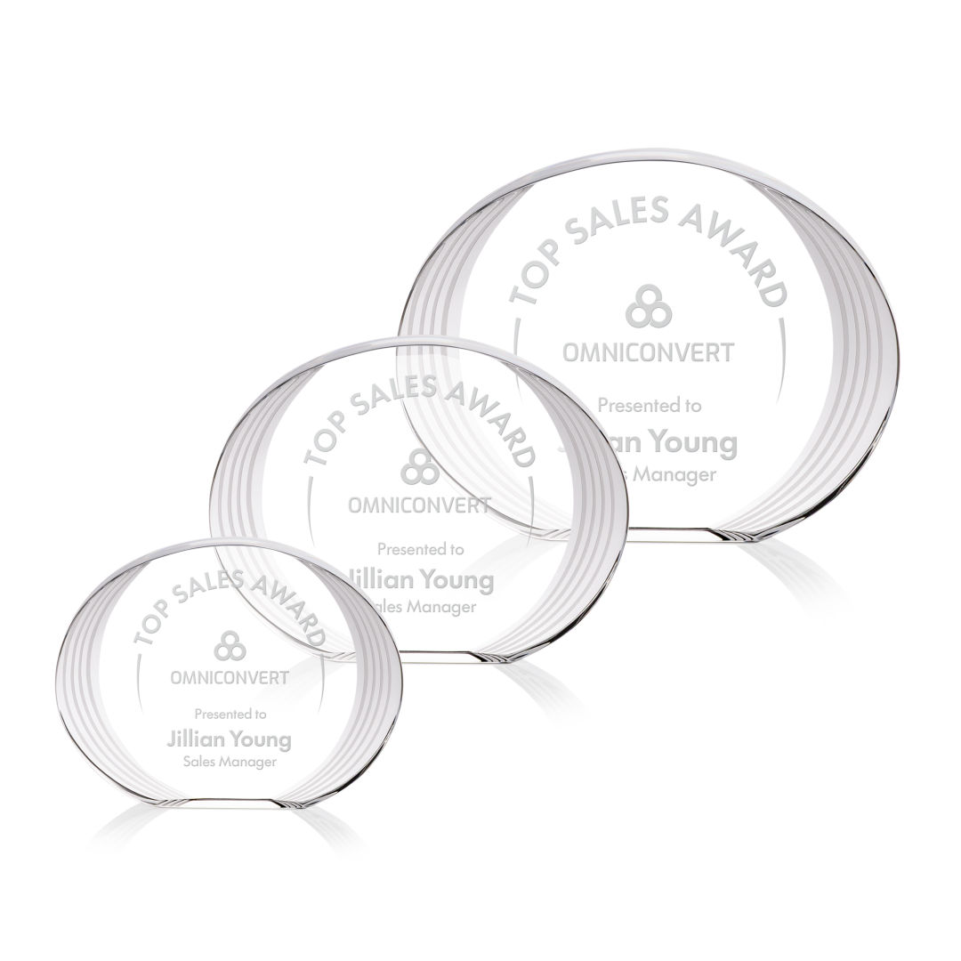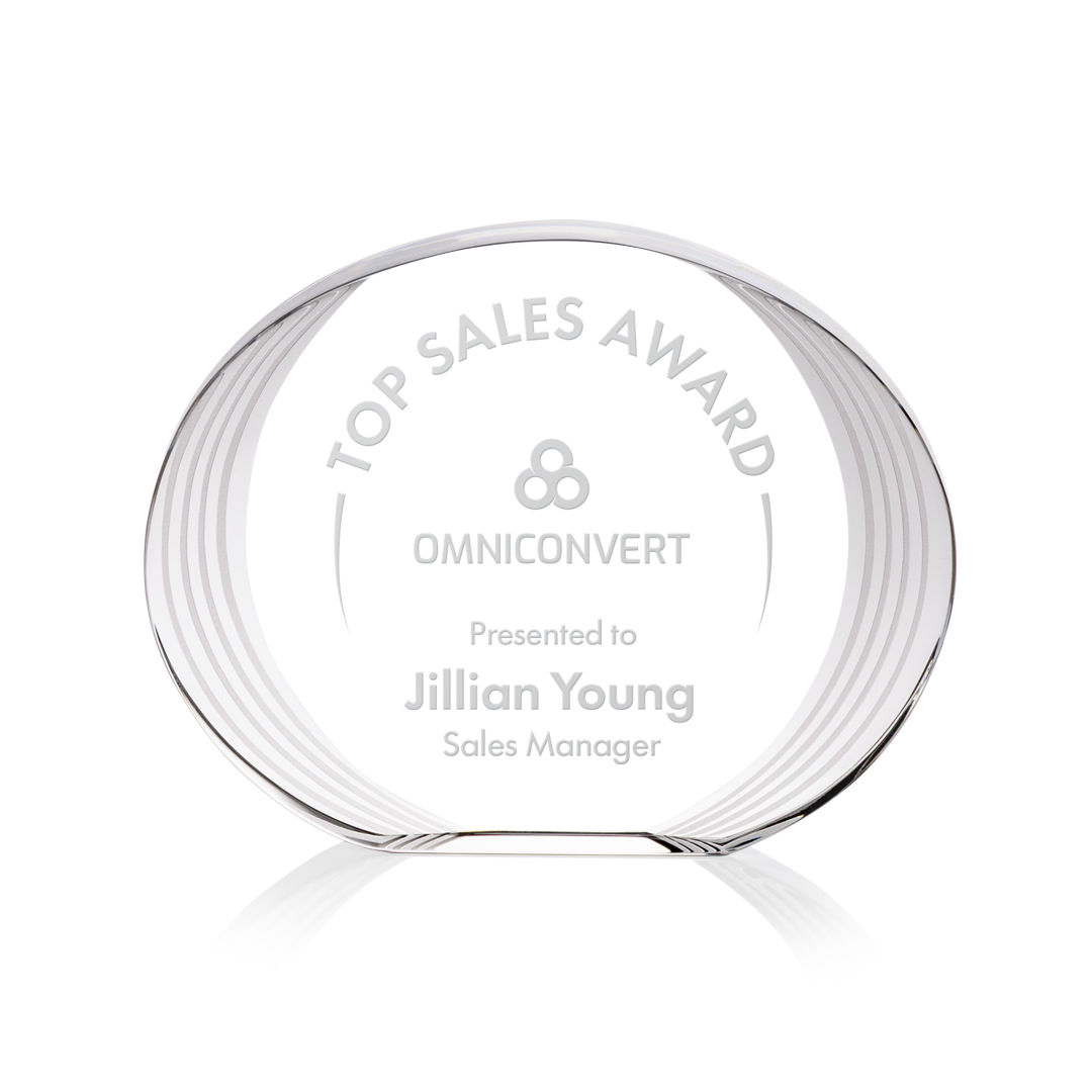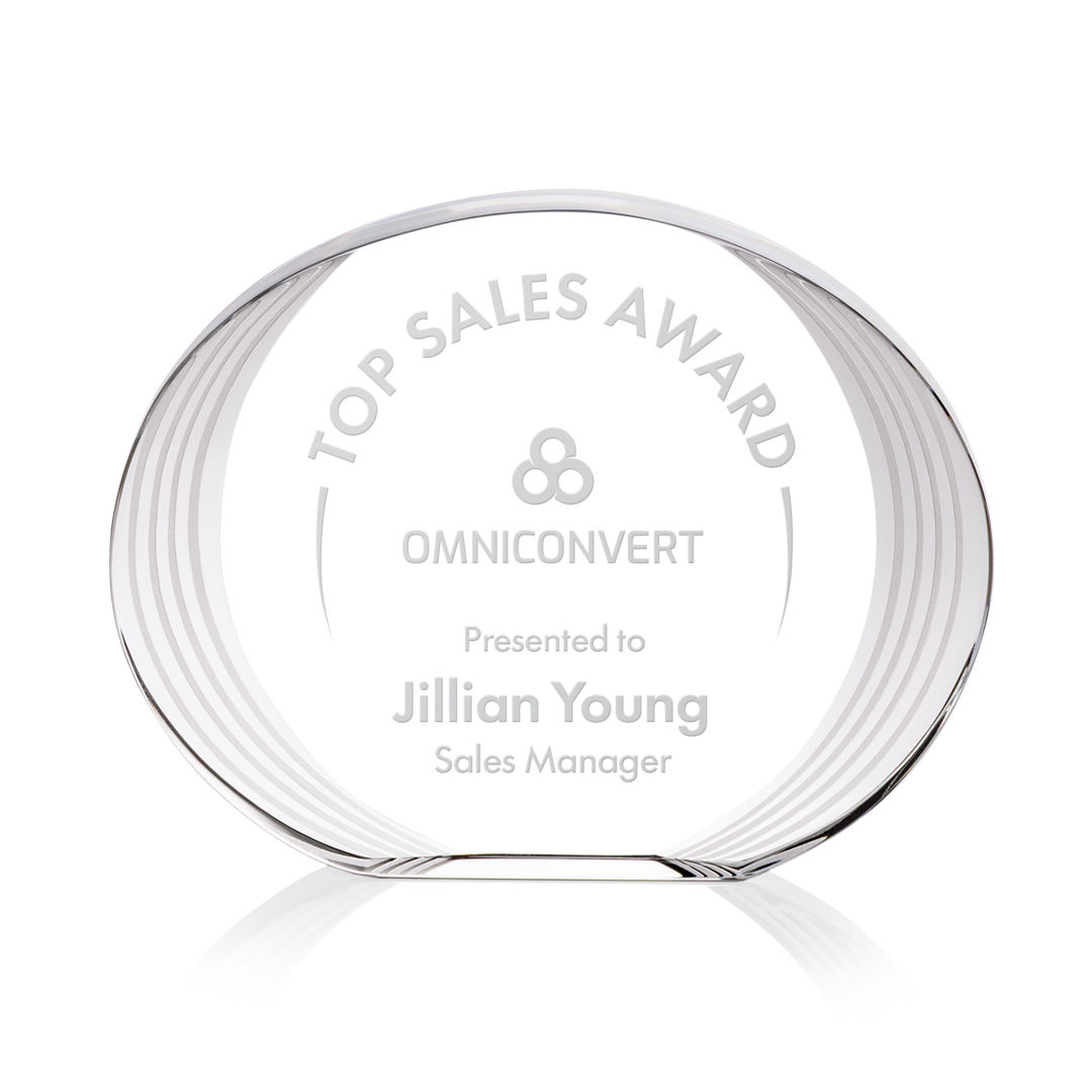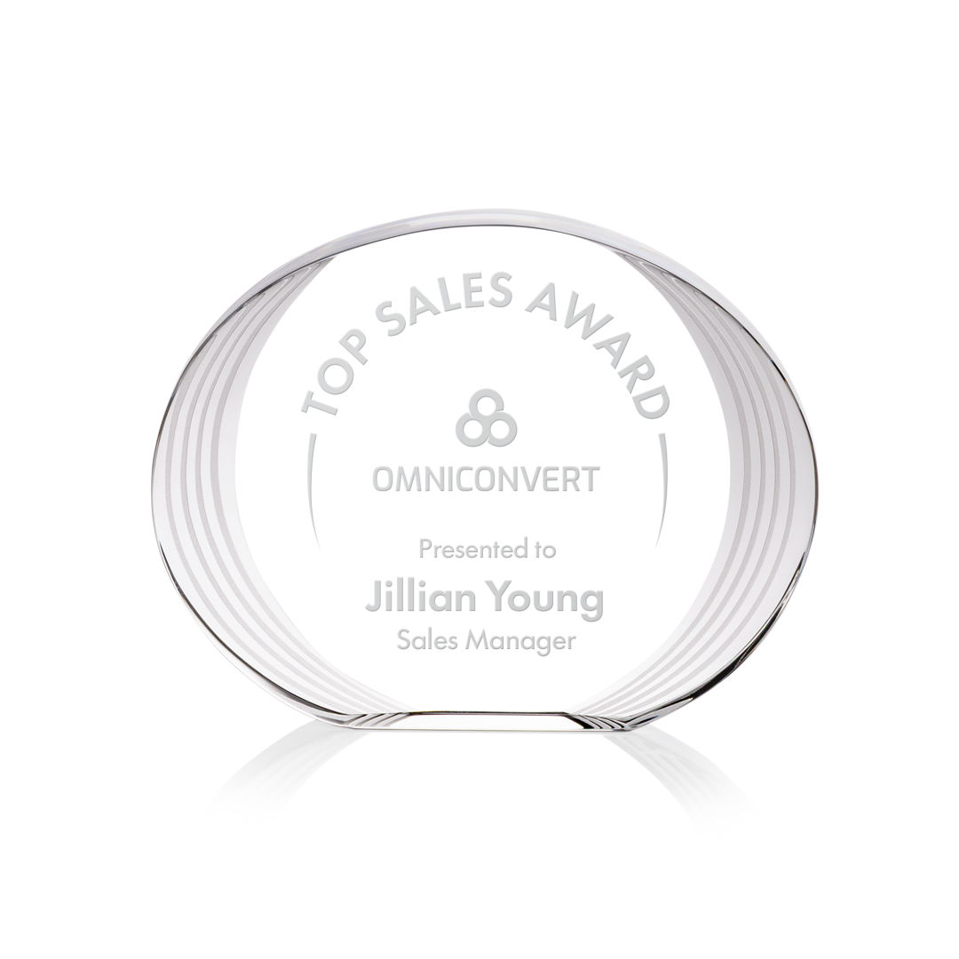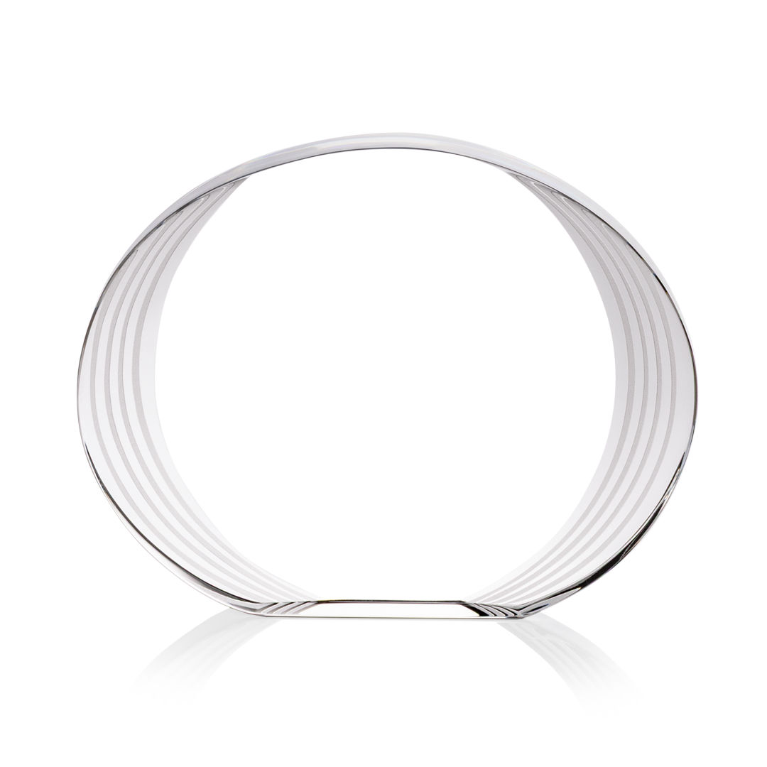 The Sheraton Oval Award showcases a sleek, freestanding oval design with a subtly concaved shape and a striped, ridged edge that draws attention to the imprint area. Its layered detailing creates depth and visual interest, elegantly framing your personalized message or logo. Refined and contemporary, this award is a striking way to recognize achievement with modern style. 5.0″ W x 4.0″ H x 1.0″ D