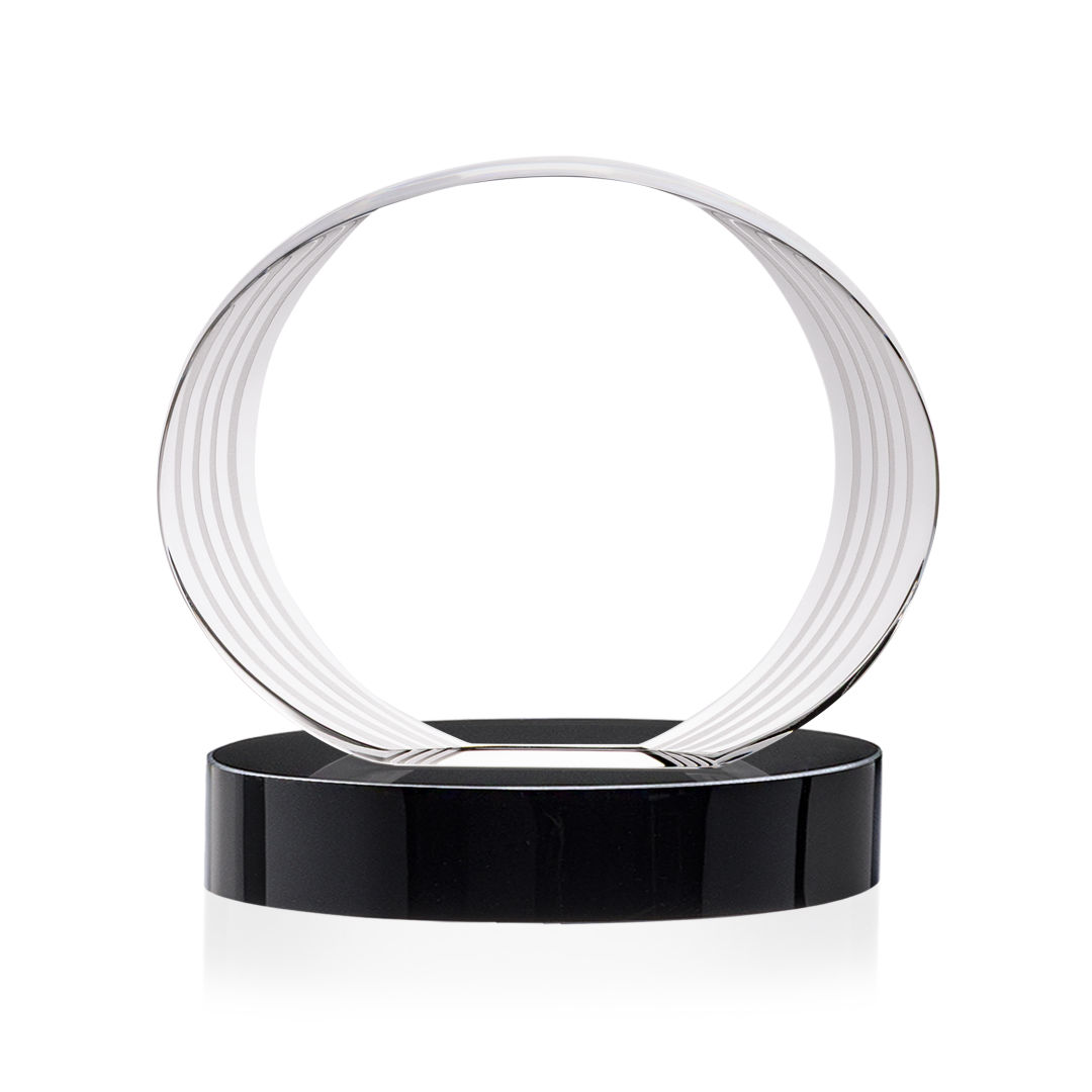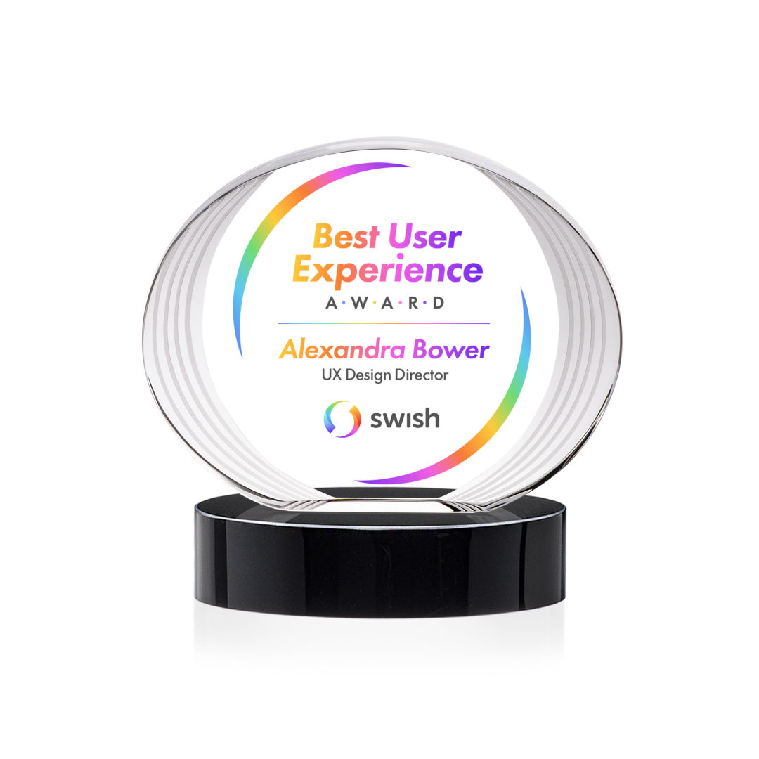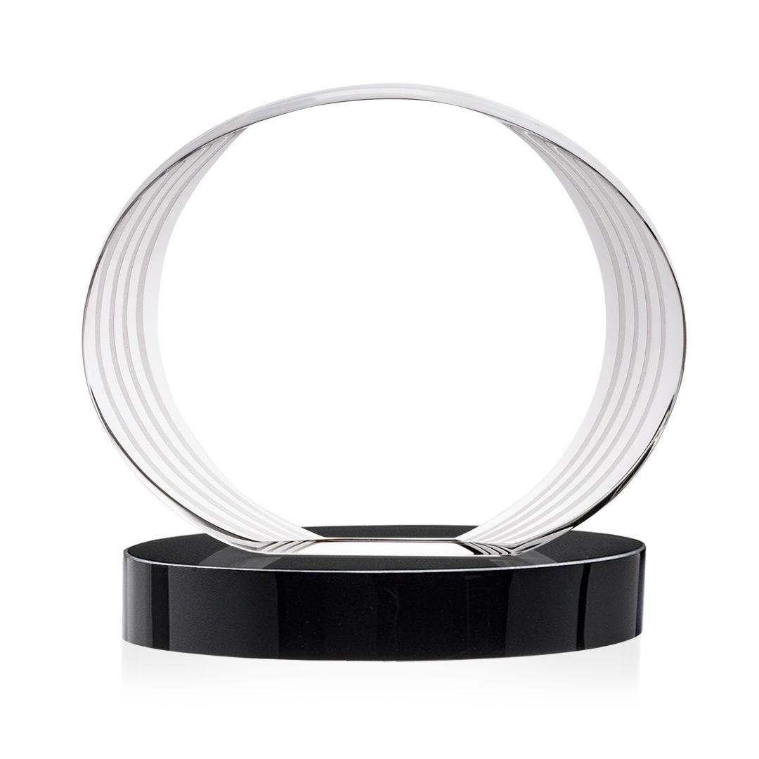 The Sheraton Oval VividPrint™ Award on Base features a sleek, concave oval design with a striped, ridged edge that creates a refined fanfare around the imprint area. Its layered detailing adds depth while elegantly highlighting your personalized message or logo. Mounted on a solid base, this award offers a polished and contemporary way to honor achievement. 5.0″ W x 5.0″ H x 2.5″ D