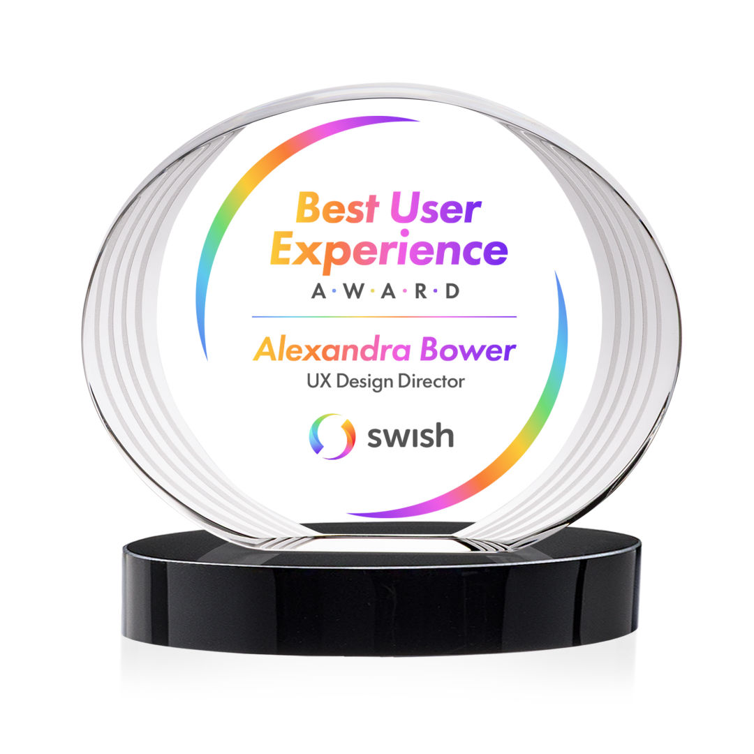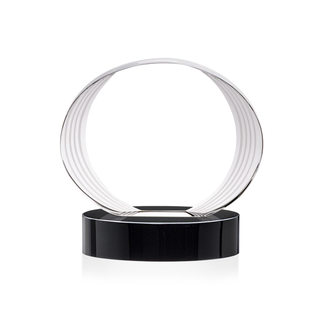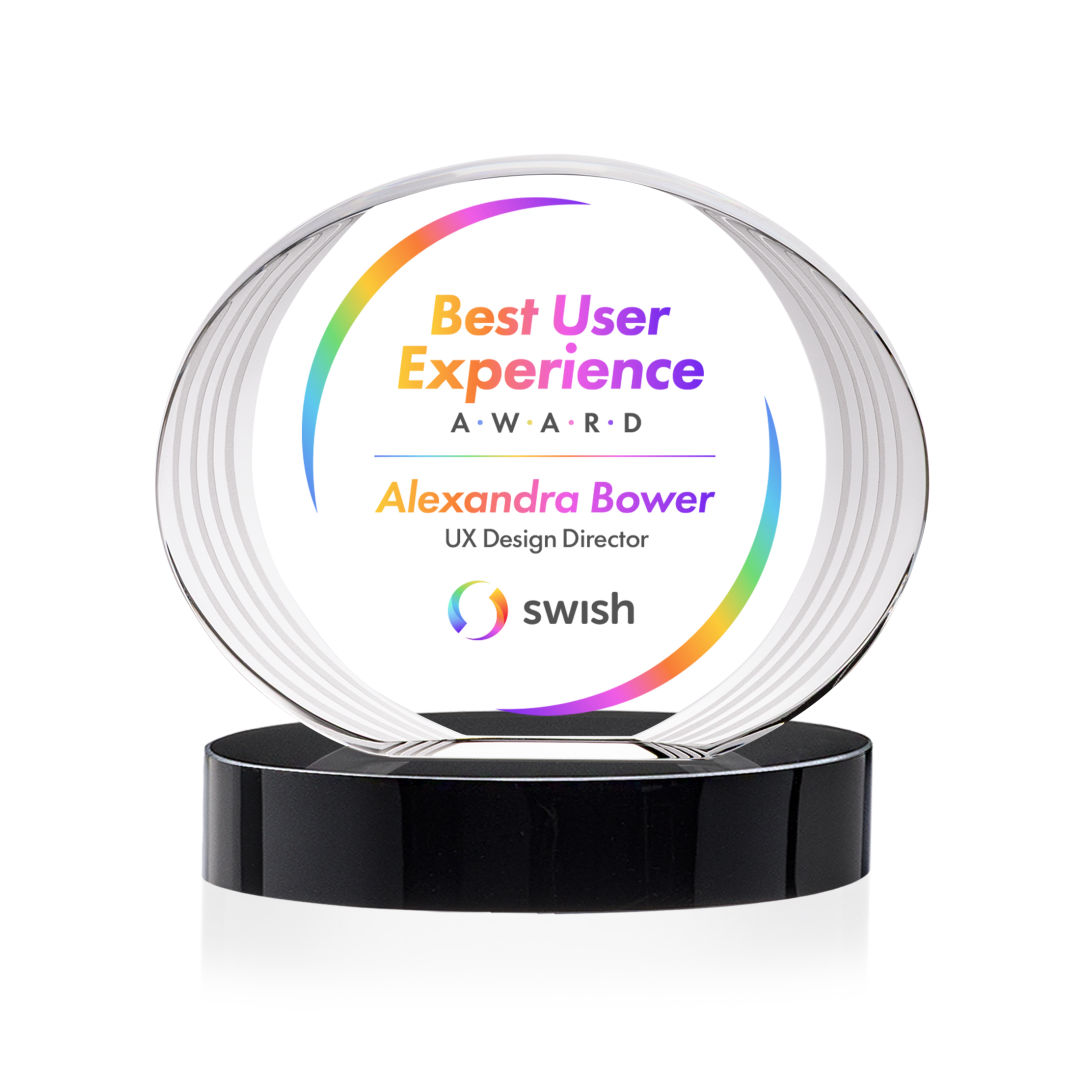 The Sheraton Oval VividPrint™ Award on Base features a sleek, concave oval design with a striped, ridged edge that creates a refined fanfare around the imprint area. Its layered detailing adds depth while elegantly highlighting your personalized message or logo. Mounted on a solid base, this award offers a polished and contemporary way to honor achievement. 5.0″ W x 5.0″ H x 2.5″ D