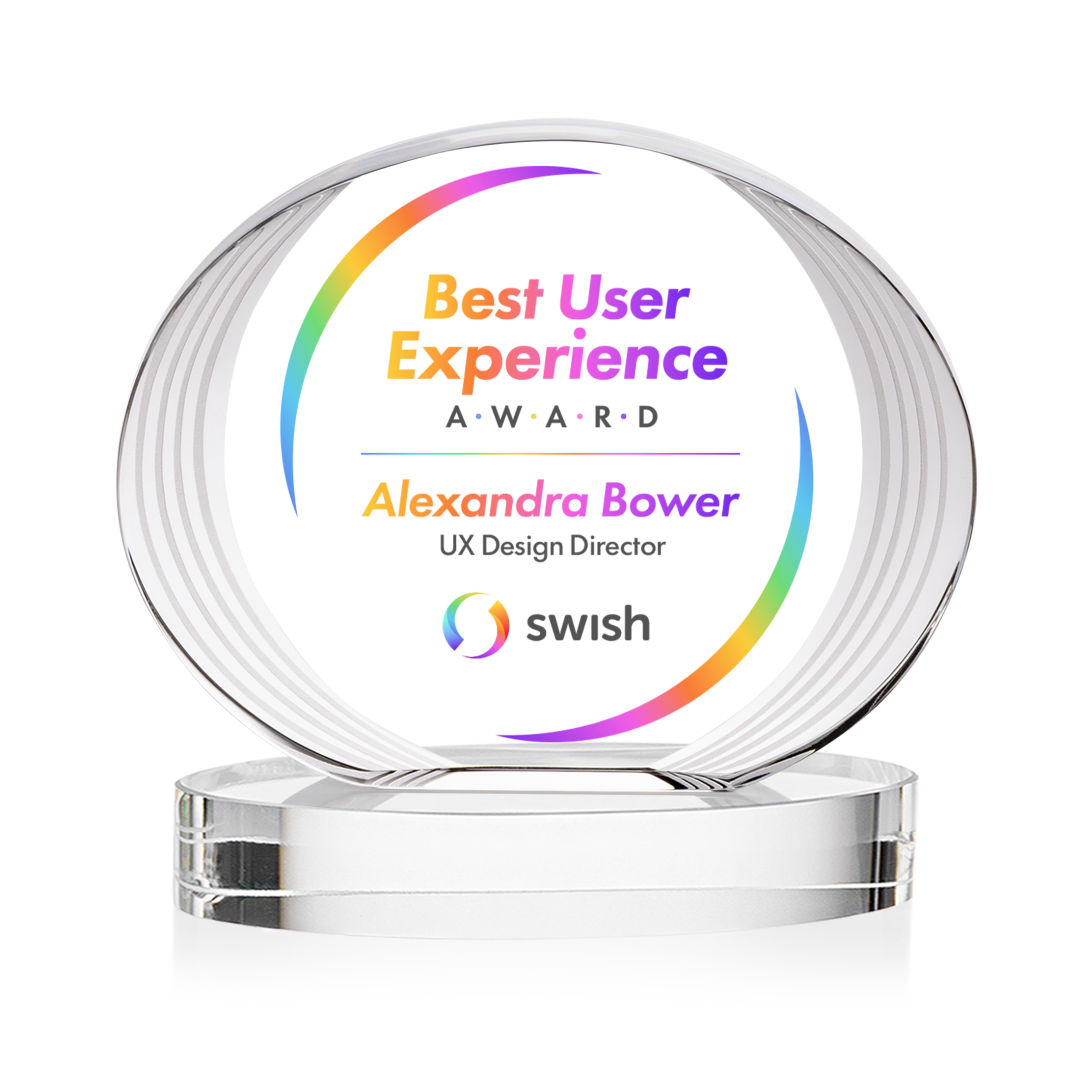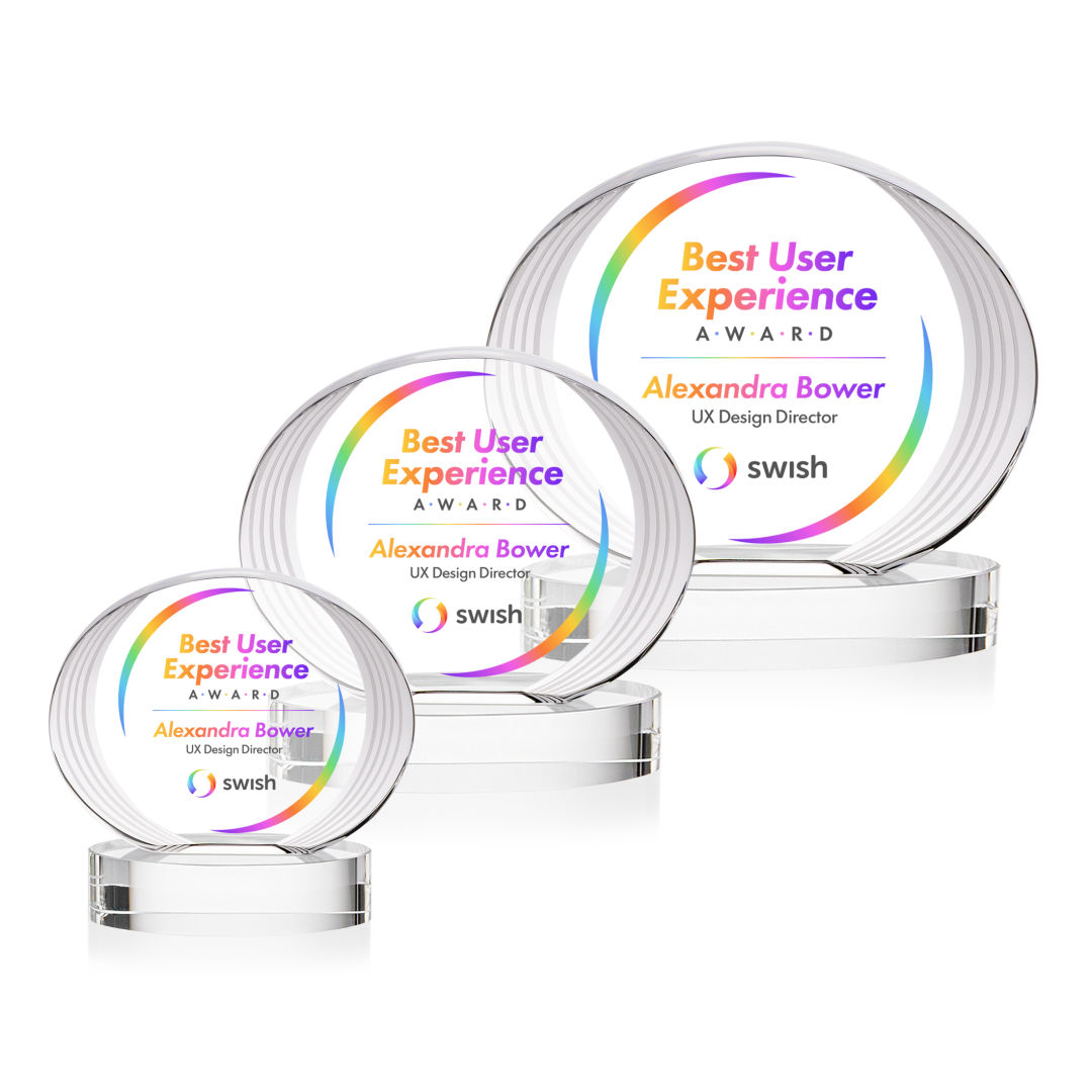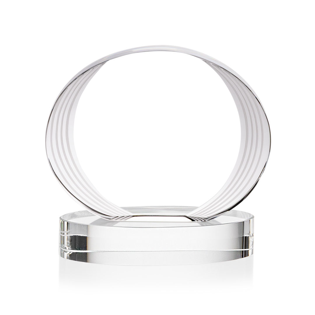 The Sheraton Oval VividPrint™ Award on Base features a sleek, concave oval design with a striped, ridged edge that creates a refined fanfare around the imprint area. Its layered detailing adds depth while elegantly highlighting your personalized message or logo. Mounted on a solid base, this award offers a polished and contemporary way to honor achievement. 5.0″ W x 5.0″ H x 2.5″ D