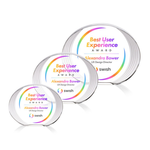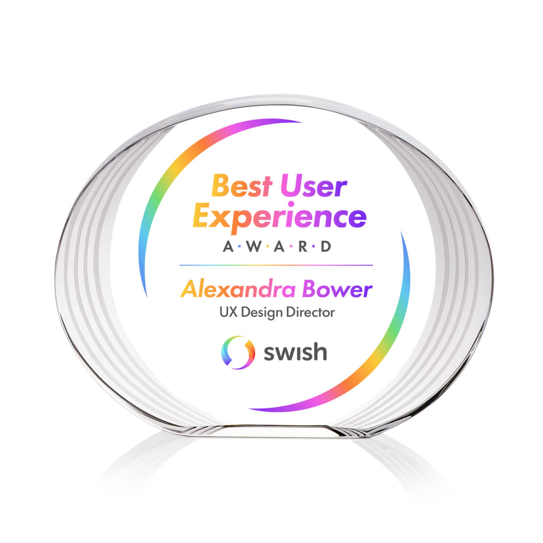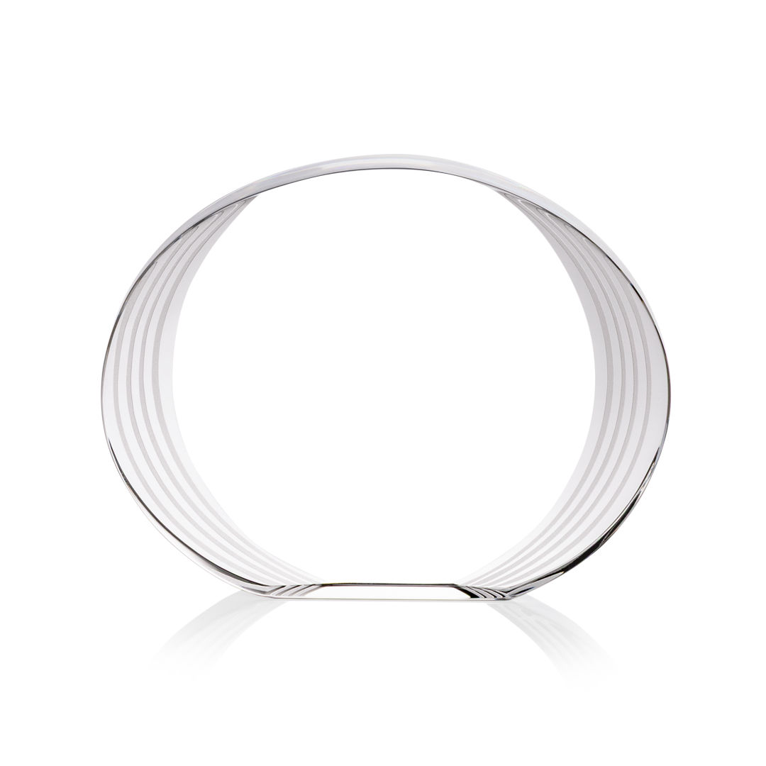The Sheraton Oval VividPrint™ Award showcases a sleek, freestanding oval design with a subtly concaved shape and a striped, ridged edge that draws attention to the imprint area. Its layered detailing creates depth and visual interest, elegantly framing your personalized message or logo. Refined and contemporary, this award is a striking way to recognize achievement with modern style. 5.0″ W x 4.0″ H x 1.0″ D