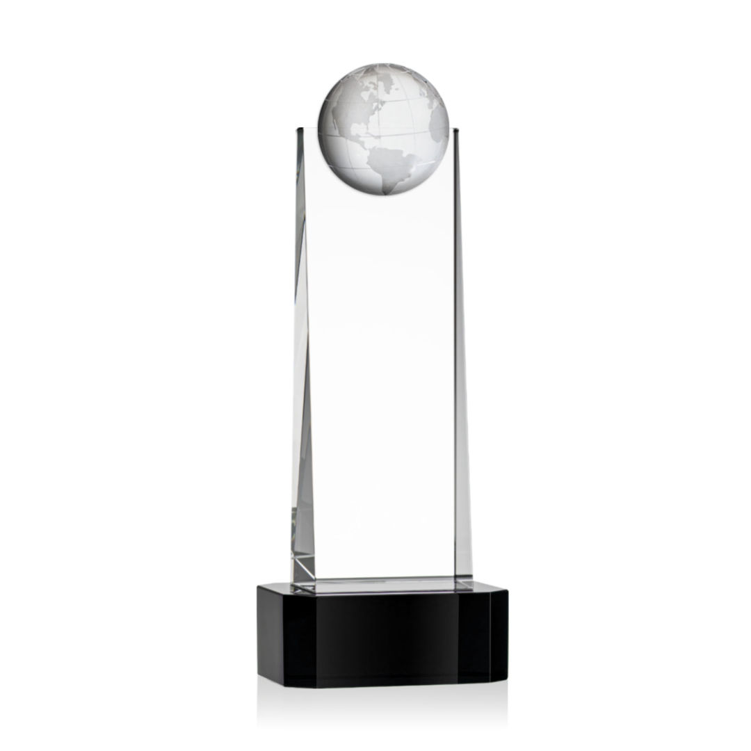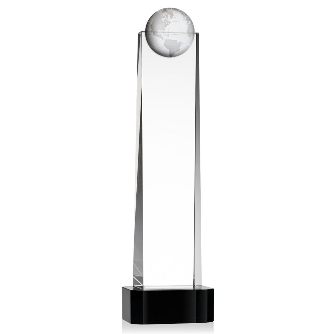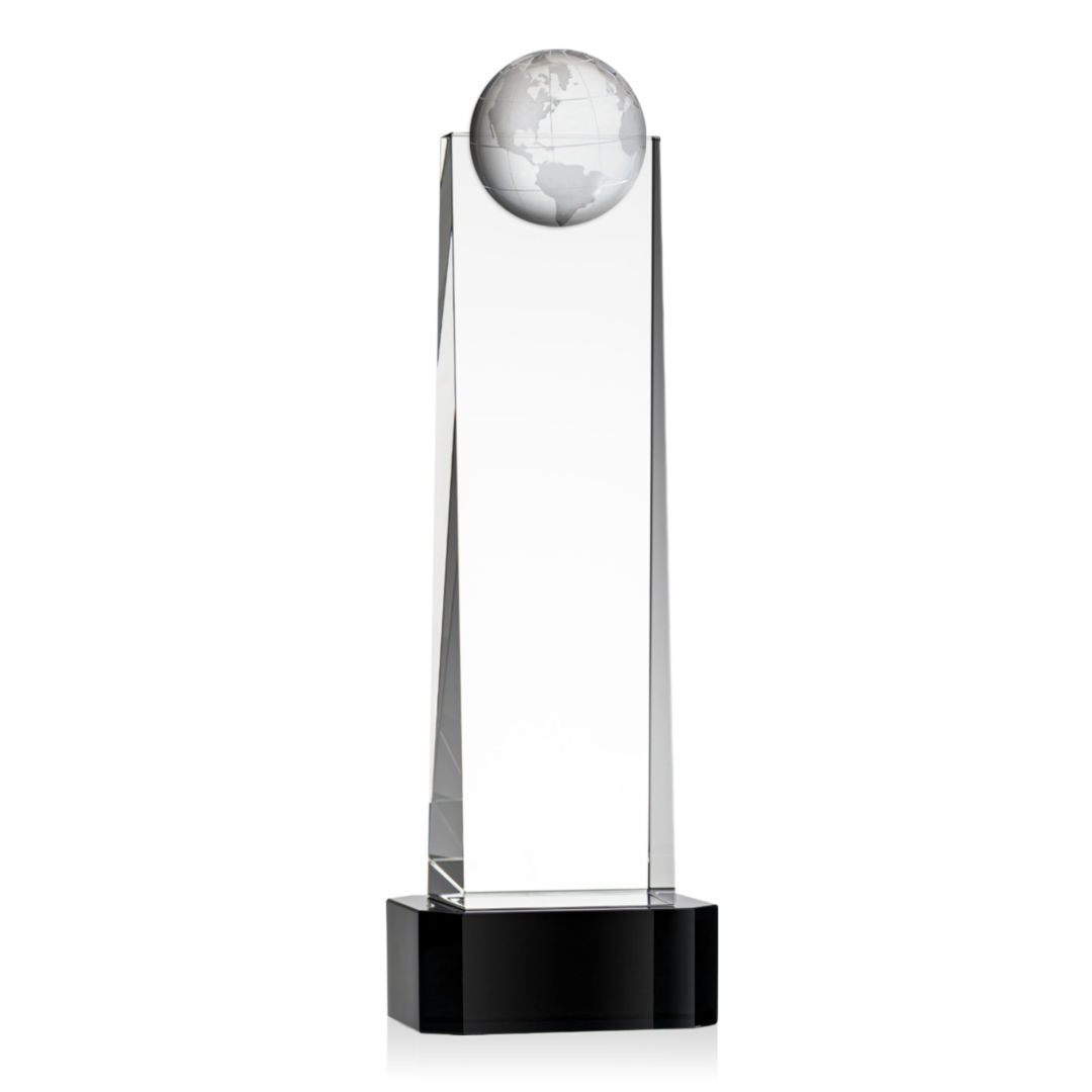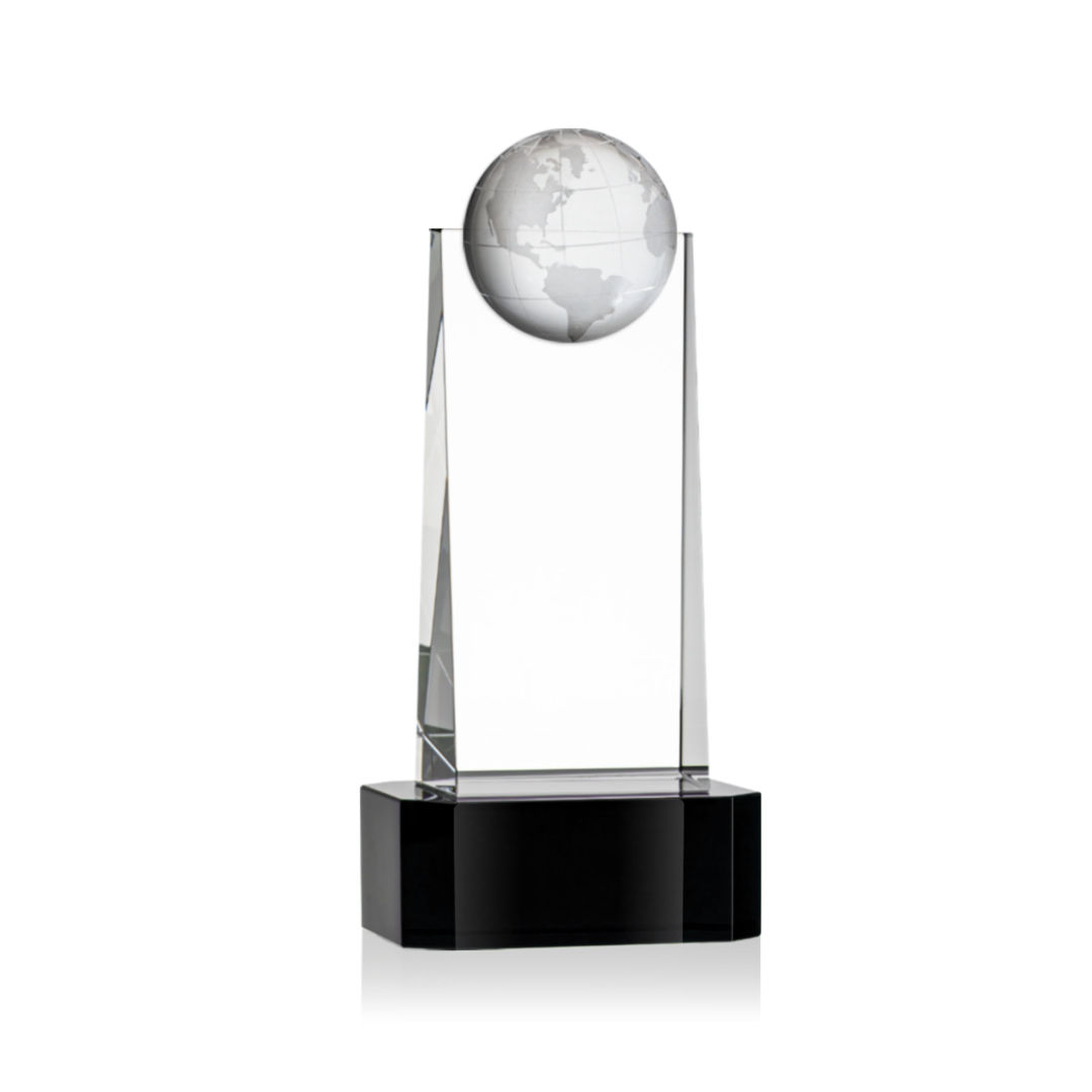 The tall Optical Crystal Sherbourne Globe VividPrint™ Award features a 3D Globe mounted on the front. A statuesque piece to recognize a global trailblazer. Mounted on an Optical Crystal base in your choice of clear, sapphire, emerald or ebony. Take your artwork to the next level with full-color VividPrint™! Available in 4 Sizes. 4.0″ W x 8.5″ H x 3.0″ D