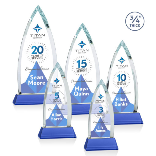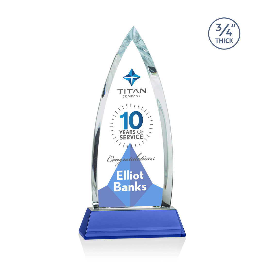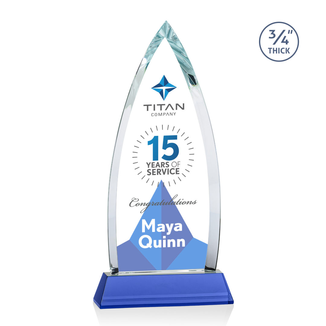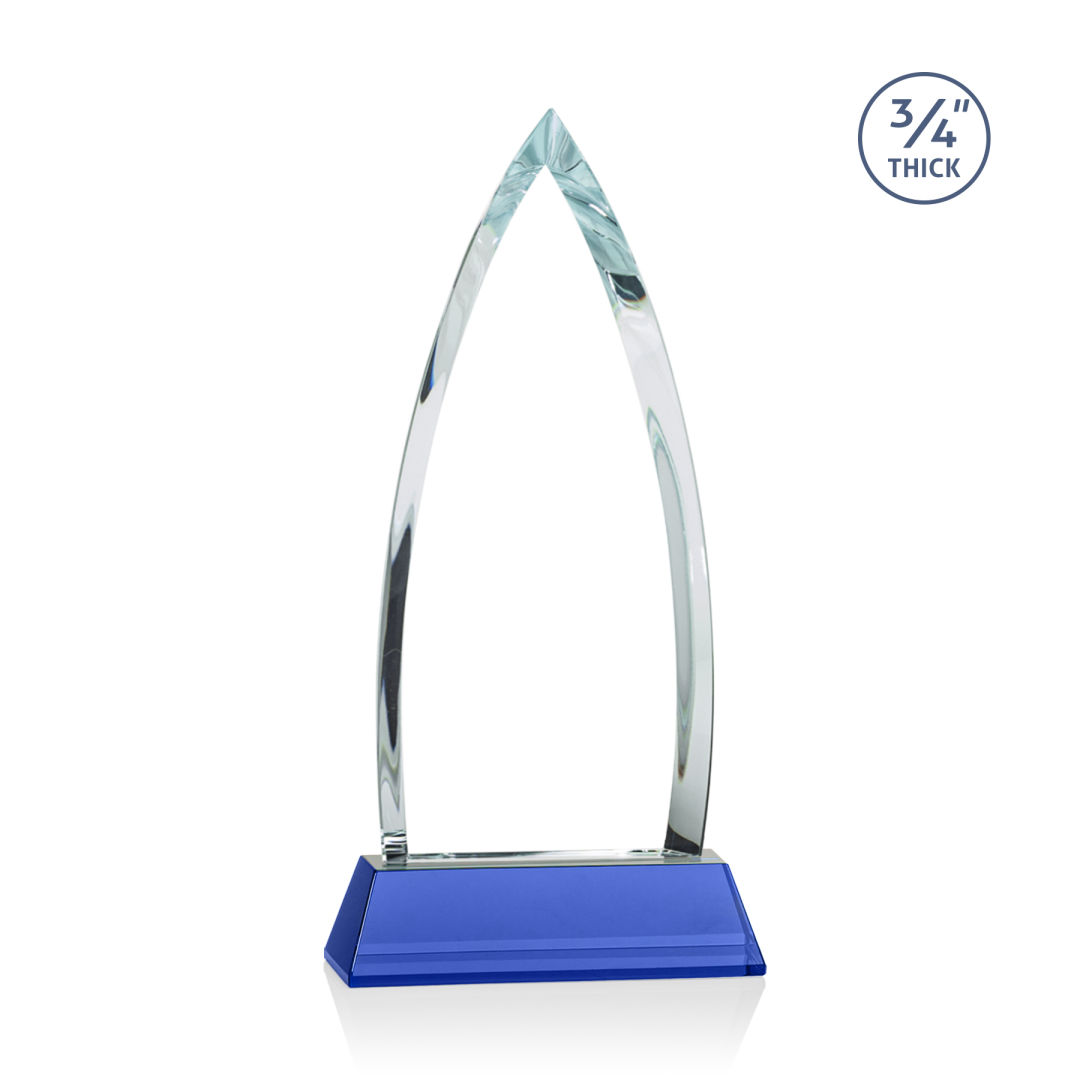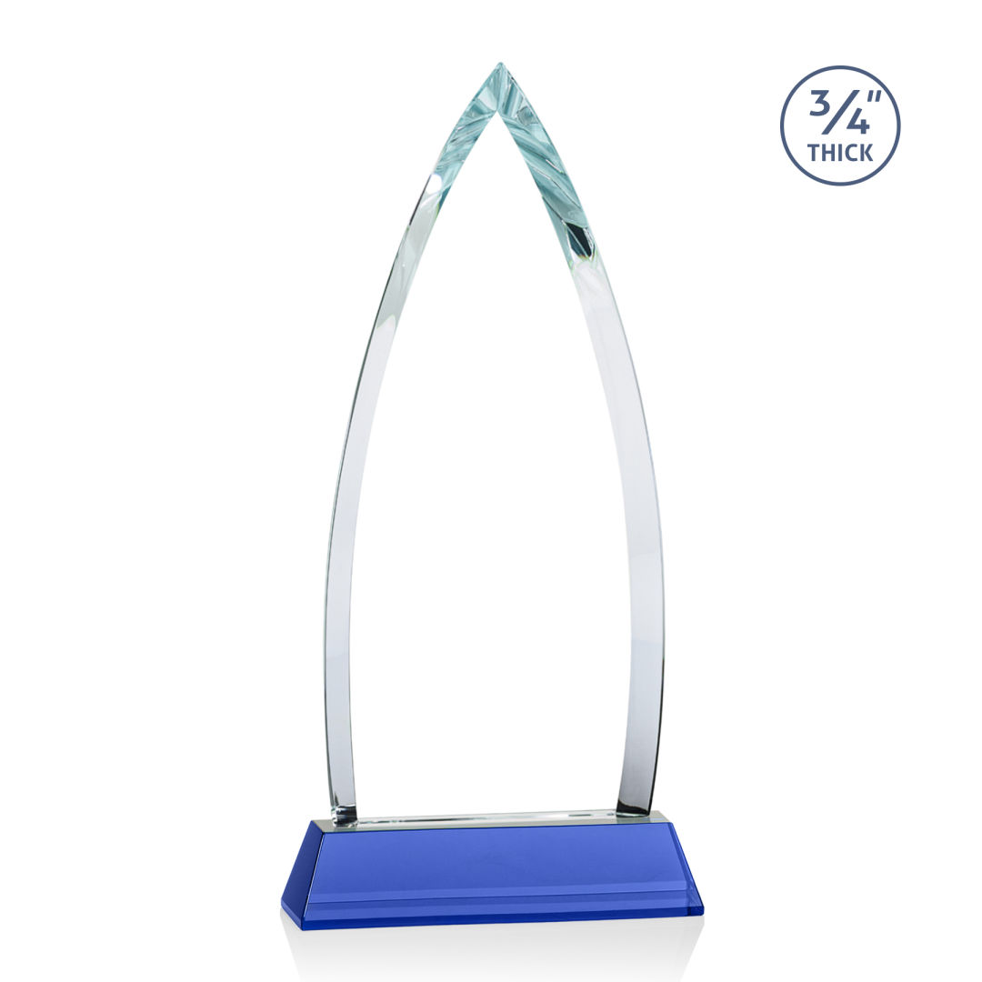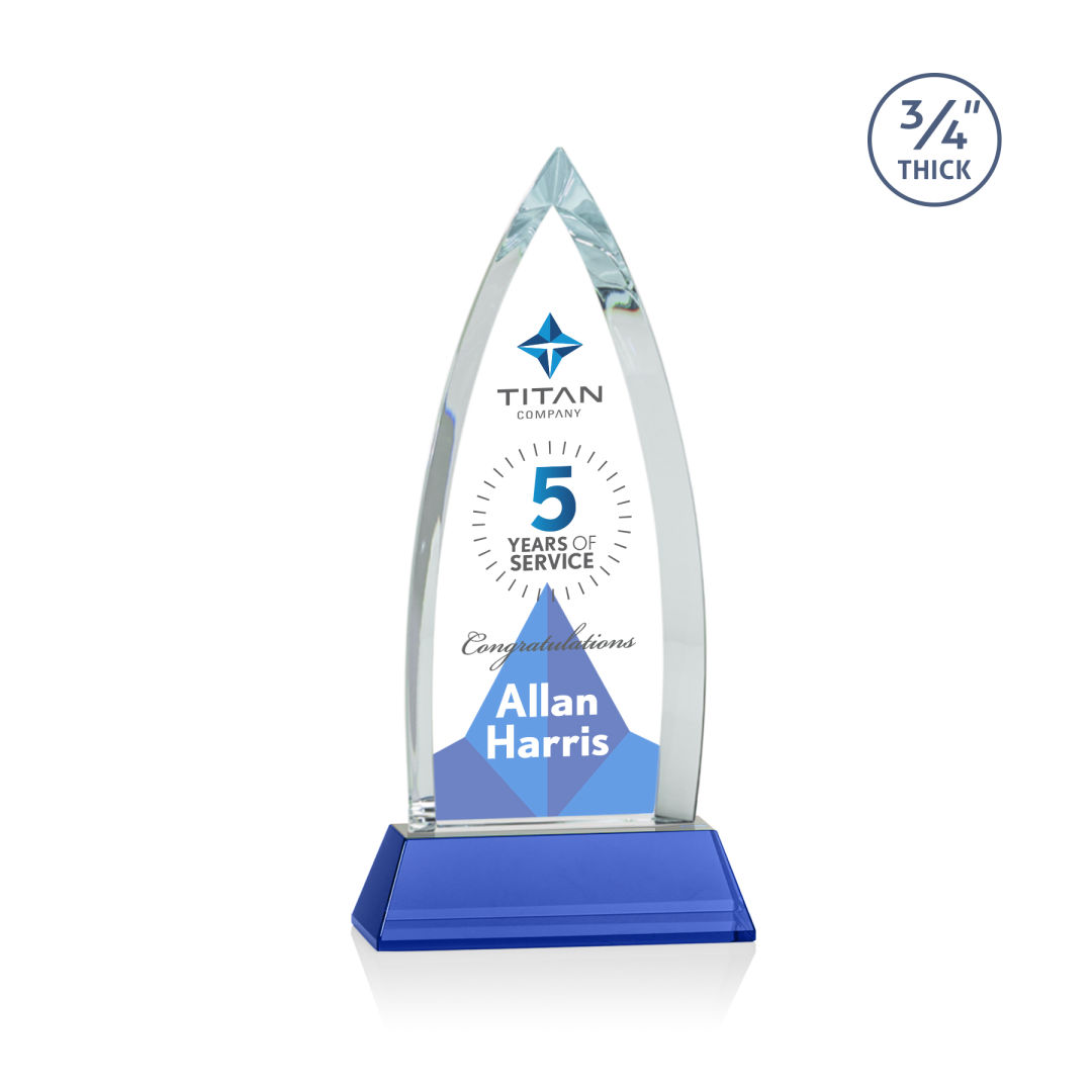The striking Shildon Award is a 3/4″ thick Starfire arrowhead with deep dramatic bevels to recognize a spectacular achievement. Mounted on a thick sapphire crystal base and includes full-color VividPrint™. Second position etch optional. 4.0″ W x 8.5″ H x 2.0″ D