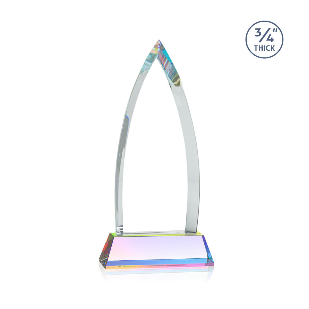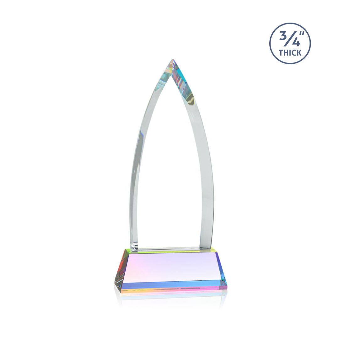 The striking Shildon Award is a 3/4″ thick Starfire arrowhead with deep dramatic bevels to recognize a spectacular achievement. Mounted on a tall prismatic Newhaven crystal base. Second position etch optional. 4.0″ W x 8.5″ H x 2.0″ D