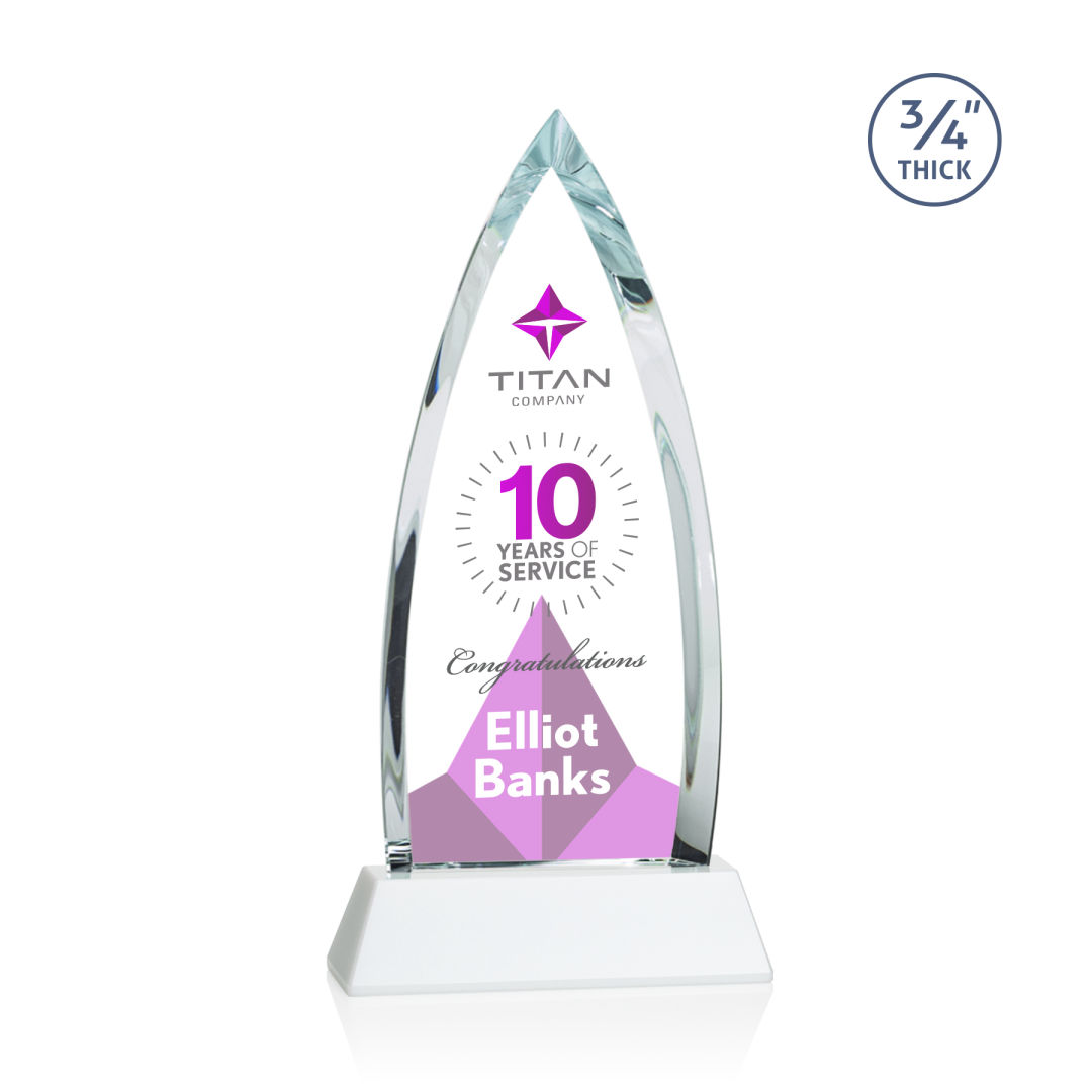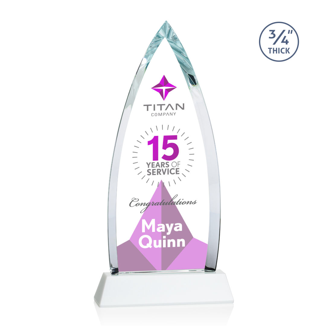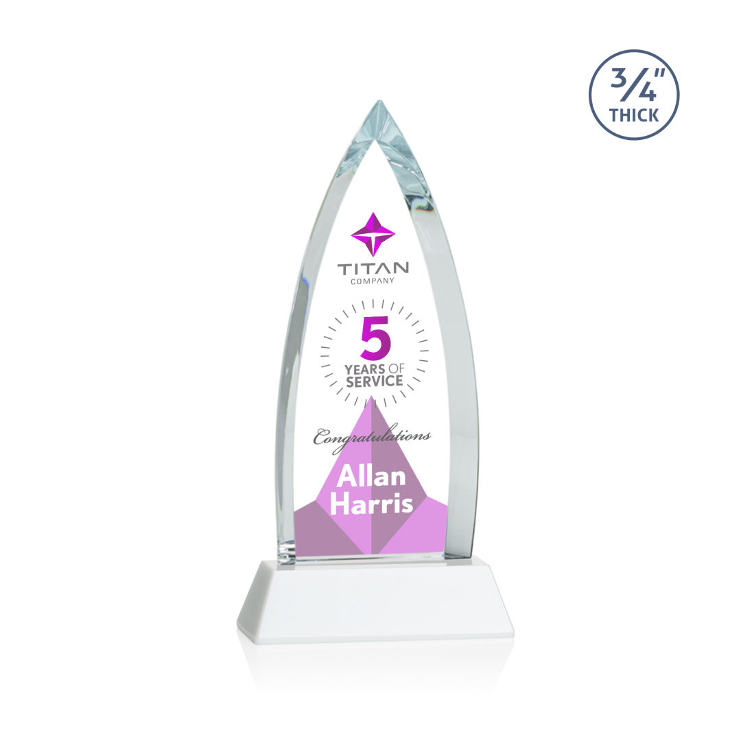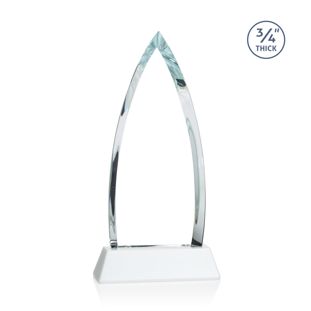 The striking Shildon Award is a 3/4″ thick Starfire arrowhead with deep dramatic bevels to recognize a spectacular achievement. Mounted on a thick ivory crystal base and includes full-color VividPrint™. Second position etch optional. 4.0″ W x 8.5″ H x 2.0″ D