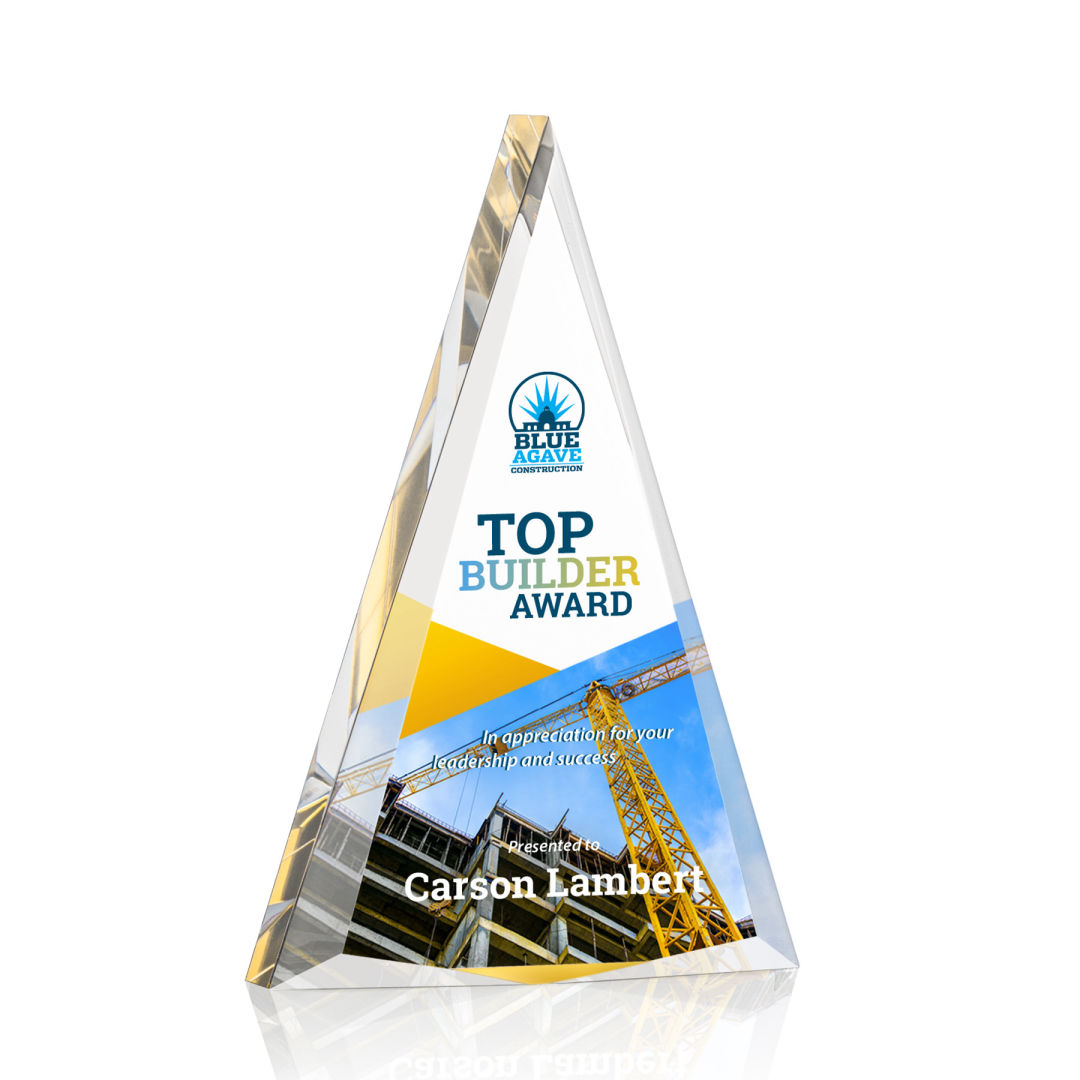 The freestanding Shrewsbury VividPrint™ Award is a testament to both craftsmanship and innovation. Let its beveled edges and captivating gold-painted bottom create a mesmerizing spectacle that reflects the significance of every achievement. The translucent quality allows light to interact with the acrylic, creating a dynamic interplay of gold reflections throughout the entire piece. 5.0″ W x 7.75″ H x 1.25″ D