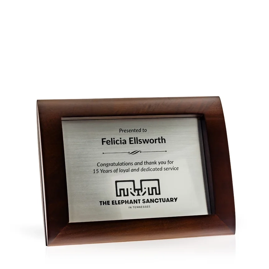 This classic looking desktop award is handcrafted from solid maple and stained to a dark brown Sienna color, hence the name. The Sienna Desktop Award is presented only in horizontal orientation. There is an insert of lightweight silver engraving stock that can be engraved with logos and award information. The Sienna Desktop Award is perfect for any desk or bookcase display and stands by use of an attractive metal pin. 6.5″ H x 8.625″ W x 1″ D