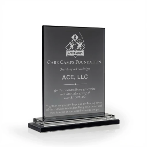 The Slate Glass Award is unique in that it features slate glass upright with clear and slate glass bases, giving an updated award look. The front is engraved and silver filled to showcase brands and award information, including logos, award title and awardee name. The upright, engraved slate glass panel is affixed to a stacked base, comprised of a top clear glass panel, and then a bottom component of smoky, slate glass to finish the striking design. 10″ H x 9″ W x 3″ D