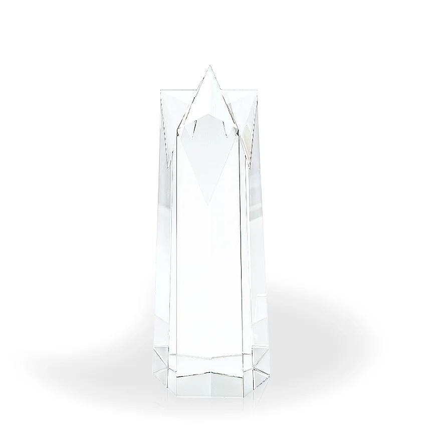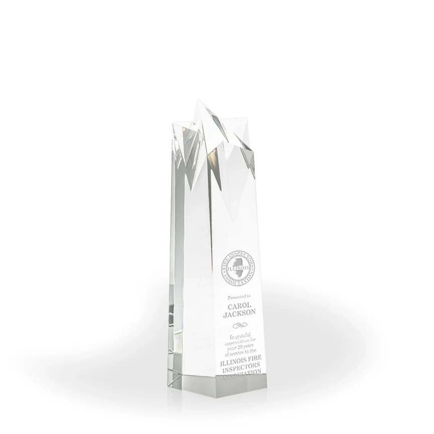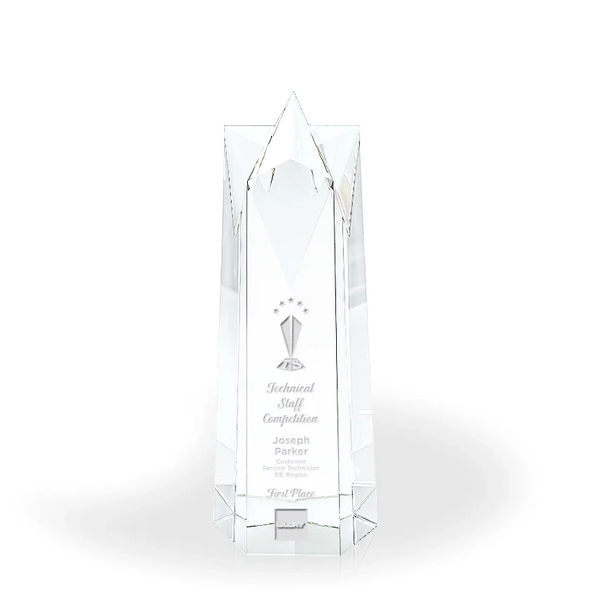 The Soaring Crystal Star Tower Award is an exceptional option when you are looking for an award group of very large awards. These awards stand at 10″, 12″ and 14″ tall and are sure to make quite an impression when you present your recipient with this year’s award. Text is engraved on the front of the award, and due to the height of the award, there is a fair amount of engraving space available. 10″ H x 3 3/4″ W x 3″ D