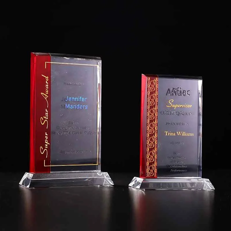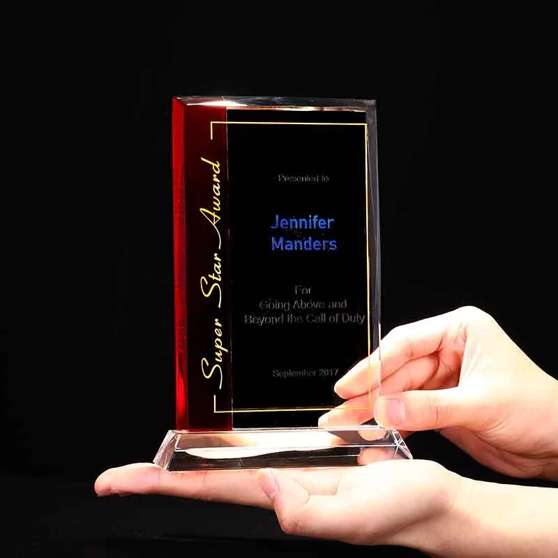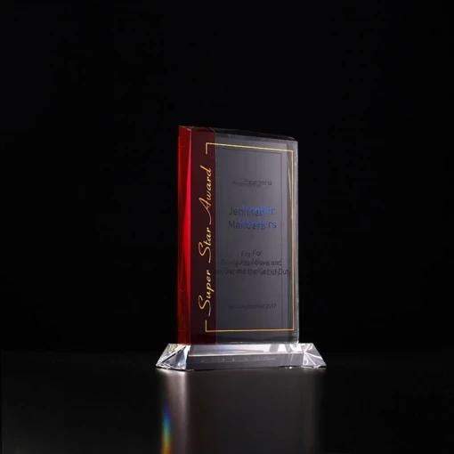 The Soleil is a stunning combination of Clear and Ruby Red Optic Crystal bonded seamlessly to create this one of a kind award. This award is perfect for abrasive etching and color fill. Each is shipped in a premium quality presentation box. 6.1″ W x 8.1″ H x 0.6″ D