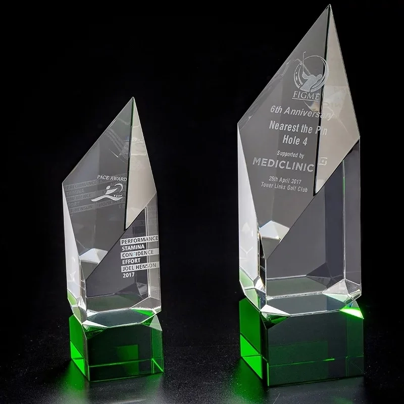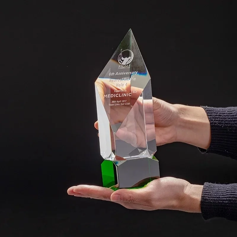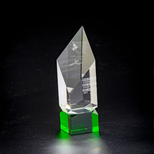The Sophia Diamond Award is a Clear Optic Crystal Diamond perfectly bonded to a Green Optic Crystal Base. This Classic Diamond shape with it’s large slanted engraving surface is the perfect Corporate Recognition Award. It is currently available in one size . Each comes in a premium quality presentation box. 7″ H x 2.8″ W x 2.8″ Thick