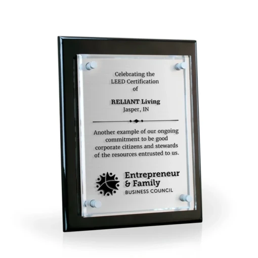 Sophisticated, contemporary, elegance… is a great way to describe the Tesla III Floating Glass Plaque series. The Tesla III Silver plaque features two dimensional design with a brushed silver plate beneath the crystal clear glass panel. The glass “floats” atop a beautiful piano-finish, black plaque board. It’s glass panel is offset from the board with four silver pins. The Tesla III Silver – Floating Glass Plaque with Plate is available in two sizes; 8″ x 10″ and 9″ x 12″. The plaques can be designed and hung vertically or horizontally. The Tesla III series is also available with a brushed gold plate and gold pins. The Tesla III Silver plaque is an excellent choice for recognizing sales achievements, dealer accomplishments, association or professional membership, years of service or retirement. 9″ W x 12″ H