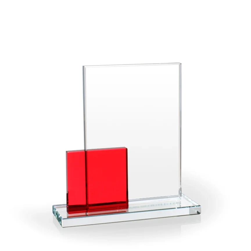 The Verve Red Square Award is a gorgeous piece made of highly polished clear glass components with a red square accent. The square component is approximately 3″ square and works well for logos, product names, award names, or other elements. Silver colorfill is included on the red square for visibility. 8″ H x 8″ W x 2 1/2″ D