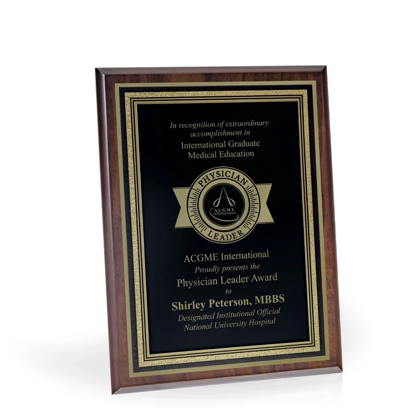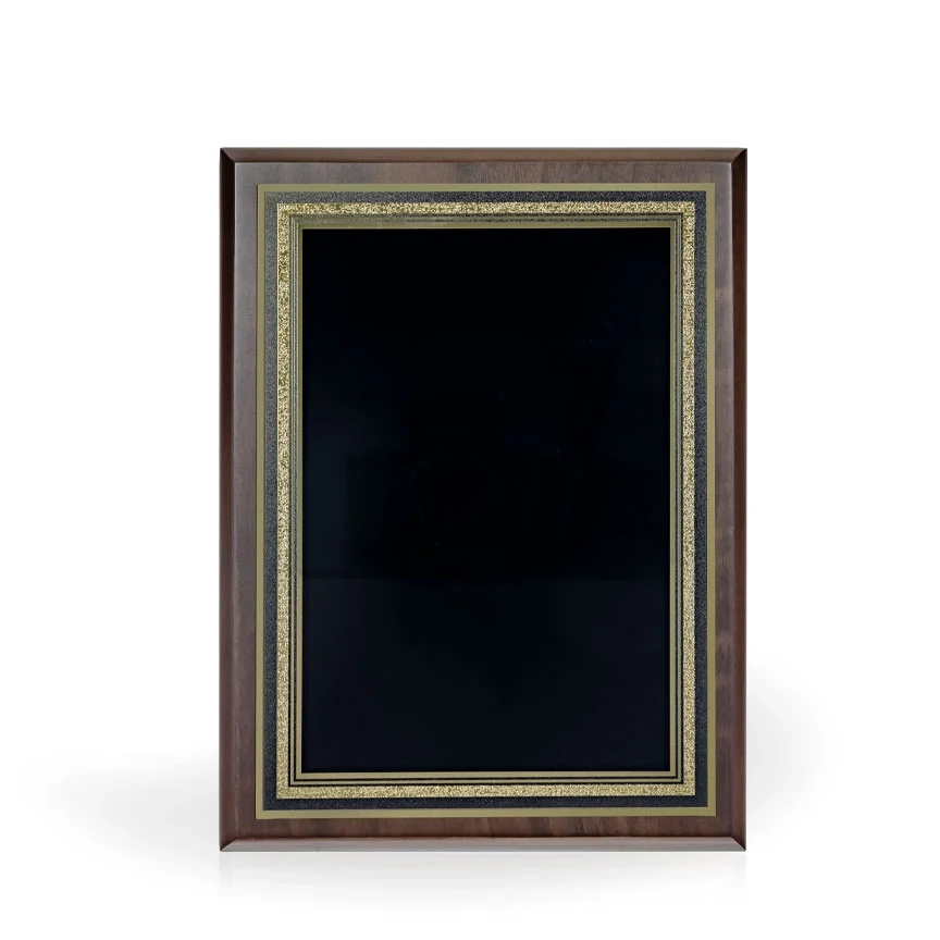 The Walker Walnut Plaque features a solid walnut plaque board, and black plate that engraves to gold colored letters. The black plate comes with a nicely detailed border which is an attractive detail to compliment your engraved logo and text. This plaque comes in 2 sizes making it a wonderful option when you need multiple sizes of an award. These plaques can be hung vertically or horizontally (keyhole on the back side). 10″ H x 8″ W x 0.5″ D