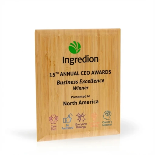 The Zen Bamboo Plaque Series is available in 3 sizes. The natural quality of the bamboo material is made elegant with the addition of a rounded eliptical edge. Each board is hand crafted lending a uniqueness to the texture and overall look. The front of each plaque allows for branding and award information to be printed in stunning color. A great choice for recognizing all level of achievement and for your award programs. 10″ H x 8″ W x 0.75″ D