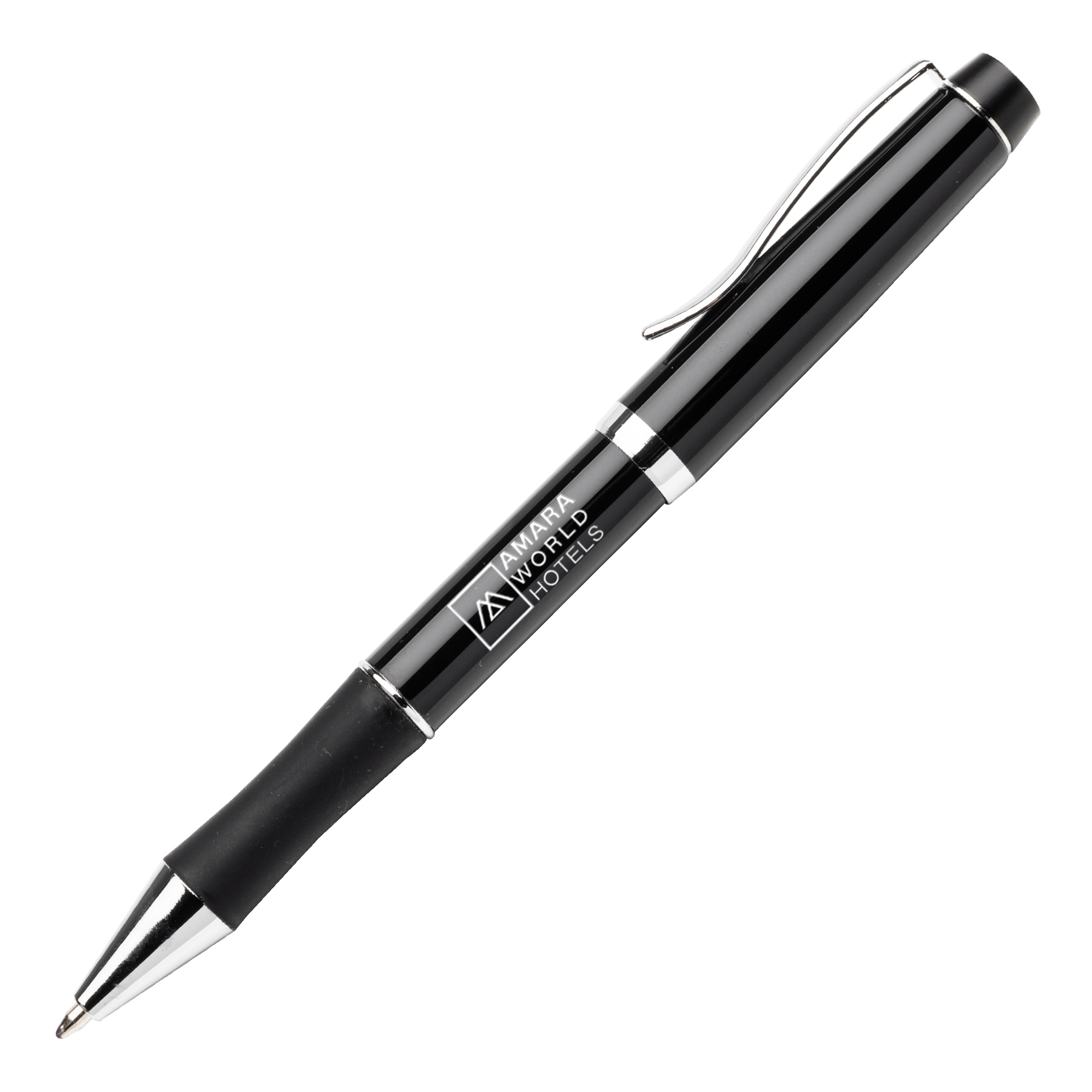Metal twist-action ballpoint pen with chrome trim and real rubber grip.