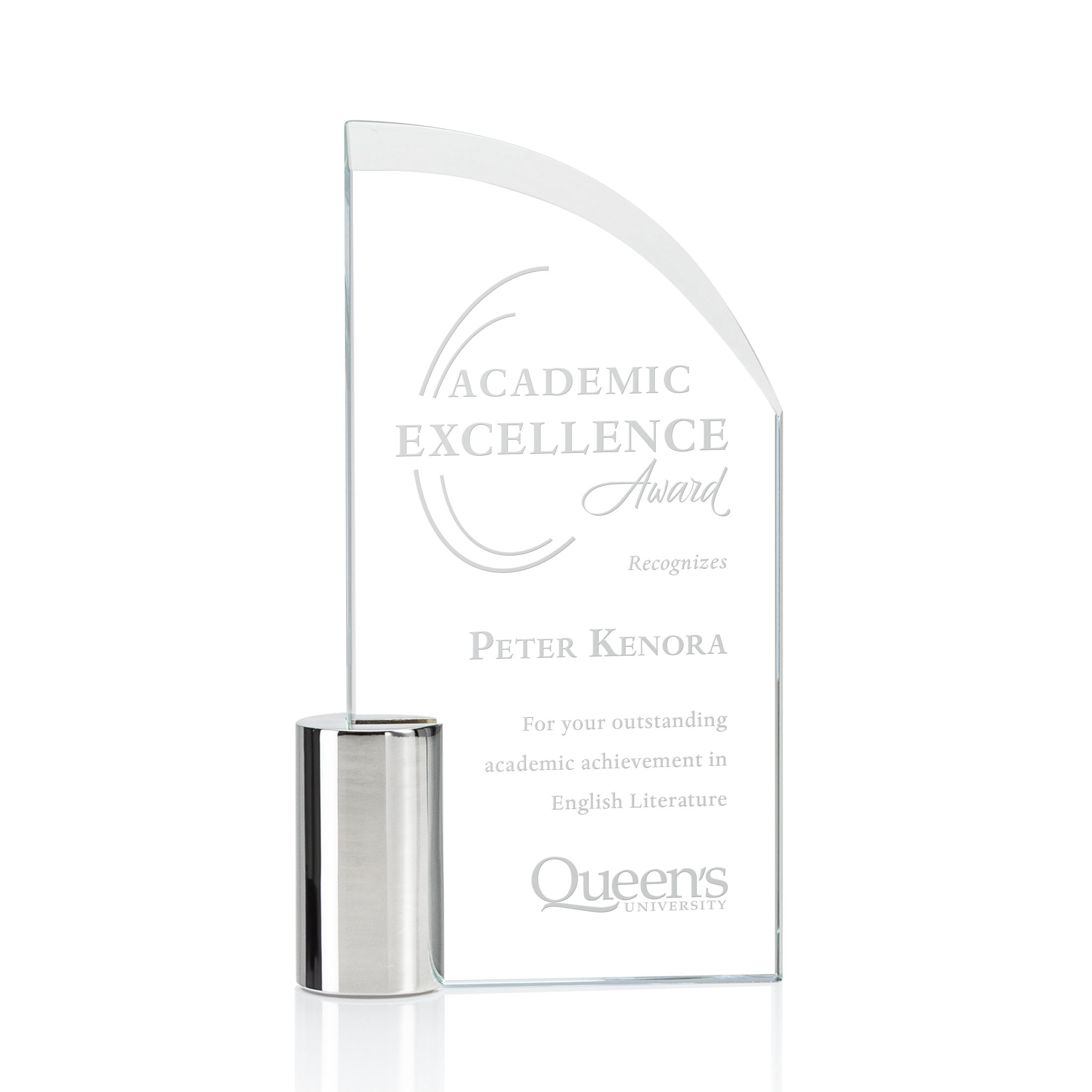 Stunning Starfire Crystal with arched bevelled top combines with a high-polished Chrome column to create a magnificent freestanding work of recognition.