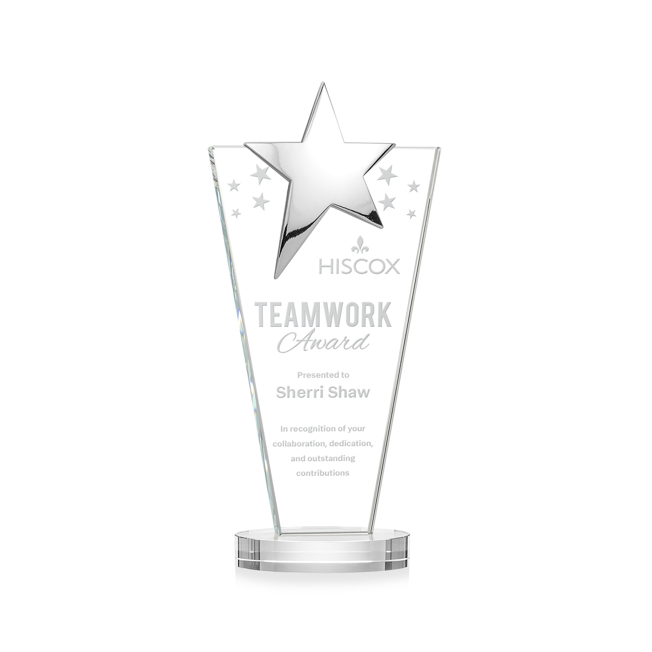 The Optical Crystal Mantella Star Award features a sleek tapered rectangle design accented by a brilliant chrome or gold star at the top. Mounted on a clear oval optical crystal base, this award radiates prestige and celebrates stellar achievement.