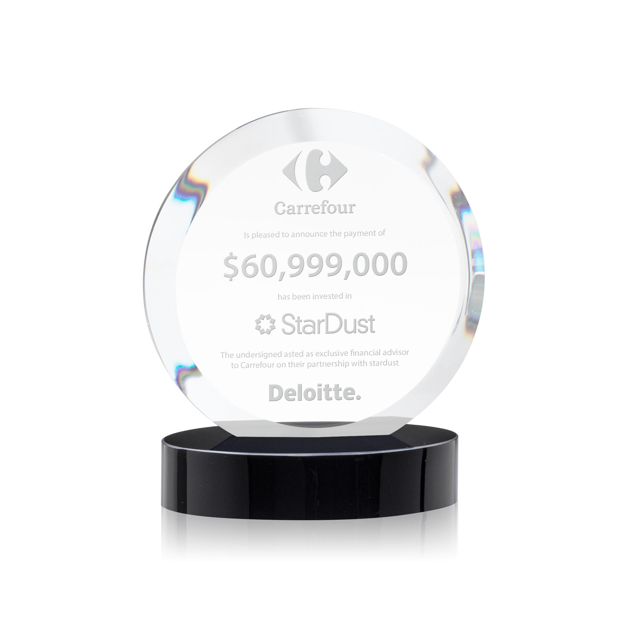 The Starfire Crystal Matlow Circle Award features a circular shape with a beautiful deep framing bevel all-around. Mounted on your choice of sapphire or ebony base.