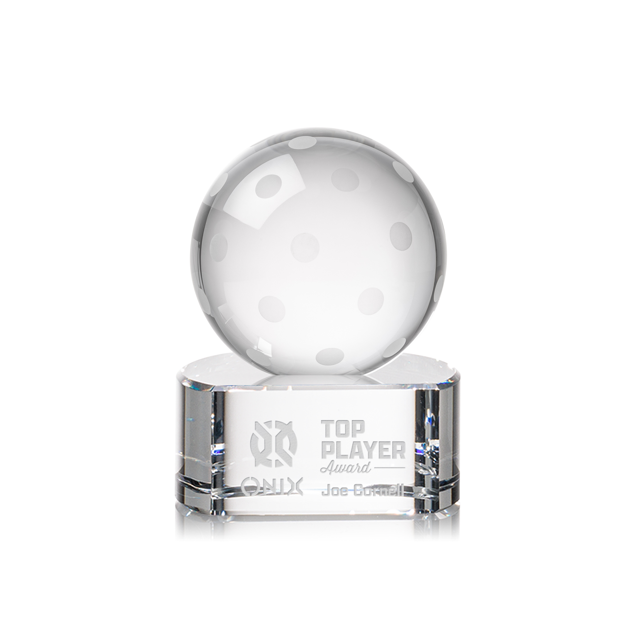 Our Pickleball Award is a tribute to the athleticism and dedication of pickleball enthusiasts. At the heart of this masterpiece is a flawlessly rendered Optical Crystal Pickleball that captures and refracts light in a captivating display. Mounted on a complimenting Optical base for personalization with a Logo or Name. An outstanding award, gift, or keepsake for pickleball tournaments, competitions, or special occasions.