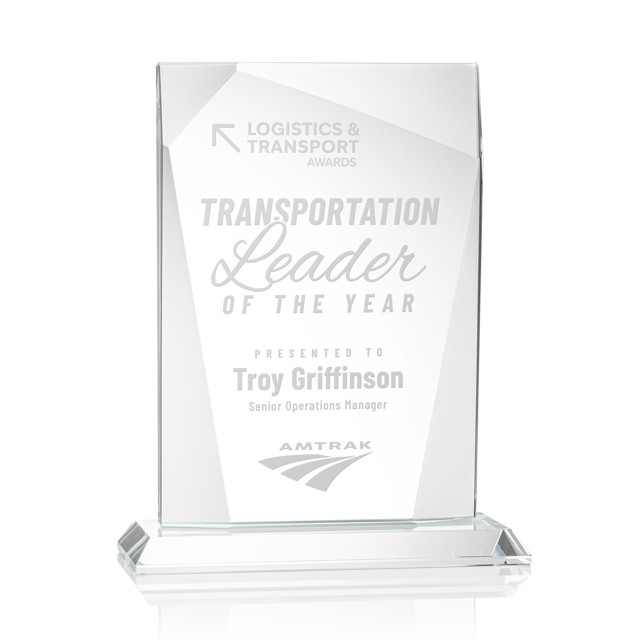 The ¾" thick Shamrock is a tall Starfire Crystal rectangular award that features geometric bevels throughout the perimeter of the imprinting area, creating a curtain effect that perfectly outlines your recognition message.